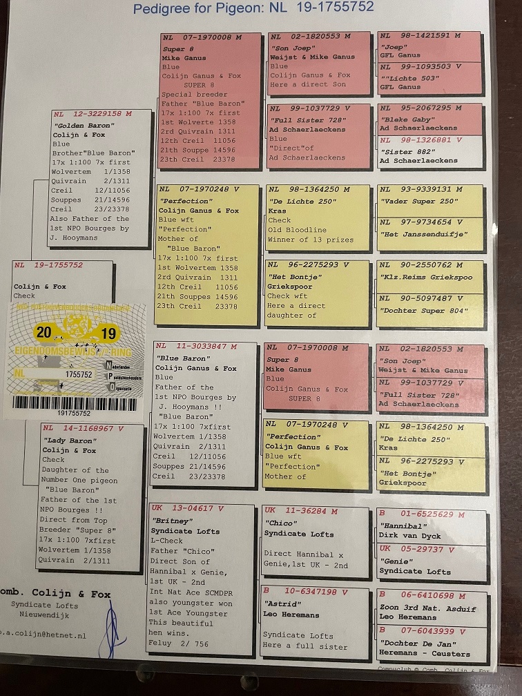 NL-1755752 MEDIUM COCK HANDELS OK BUT HAS BRED MANY WINNERS OUT TO 350 MILES, SUPER 46 BLOOD HAS BEEN SUPER FOR ME. HE HAS BRED 1ST=4X 4X IN THE MONEY 3RD-4TH-5TH AVG SPEED,CLUB 1ST HIGH POINT CLUB AND 2X1ST IN CLUB SINCE 2021, I HAVE ONLY BRED ONE SON 1006 AND HE HAS BRED CLUB AND MONEY WINNERS EVERY YEAR THEY HAVE RACED. MAKING A MISTAKE BUT HAVE TO CUT WHY BACK I HAVE 5 SONS AND 4 DAUGHTERS NEED TO BREED THIS YEAR. LOOK AT PEDIGREE HIS FULL BROTHER THIS YEAR BRED 1ST PLACE 315 MILES.