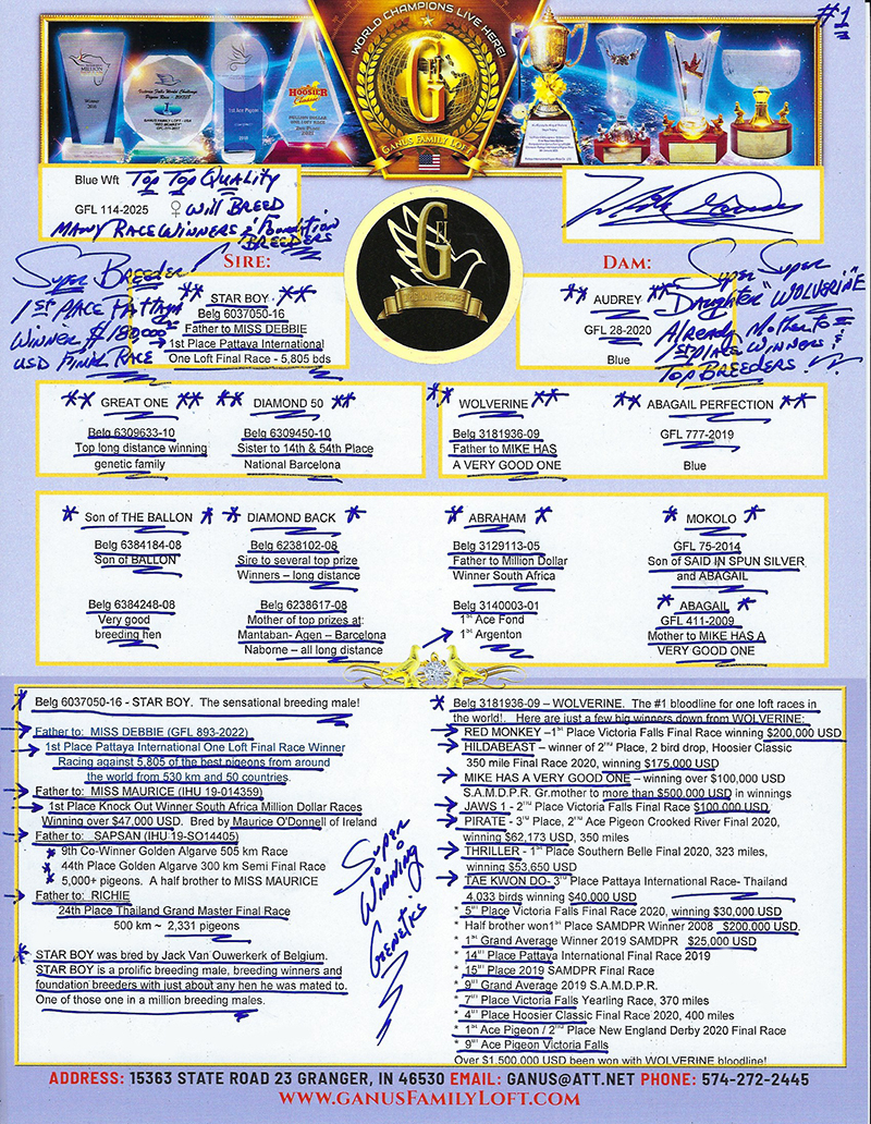 “PERFECT LADY” GFL-114-2025 Blue Wft. Hen DIRECT DAUGHTER off “STAR BOY” Belg.6037050-2016~!! He is the Father to many race winners and top breeders around the World. Here are just a few~!