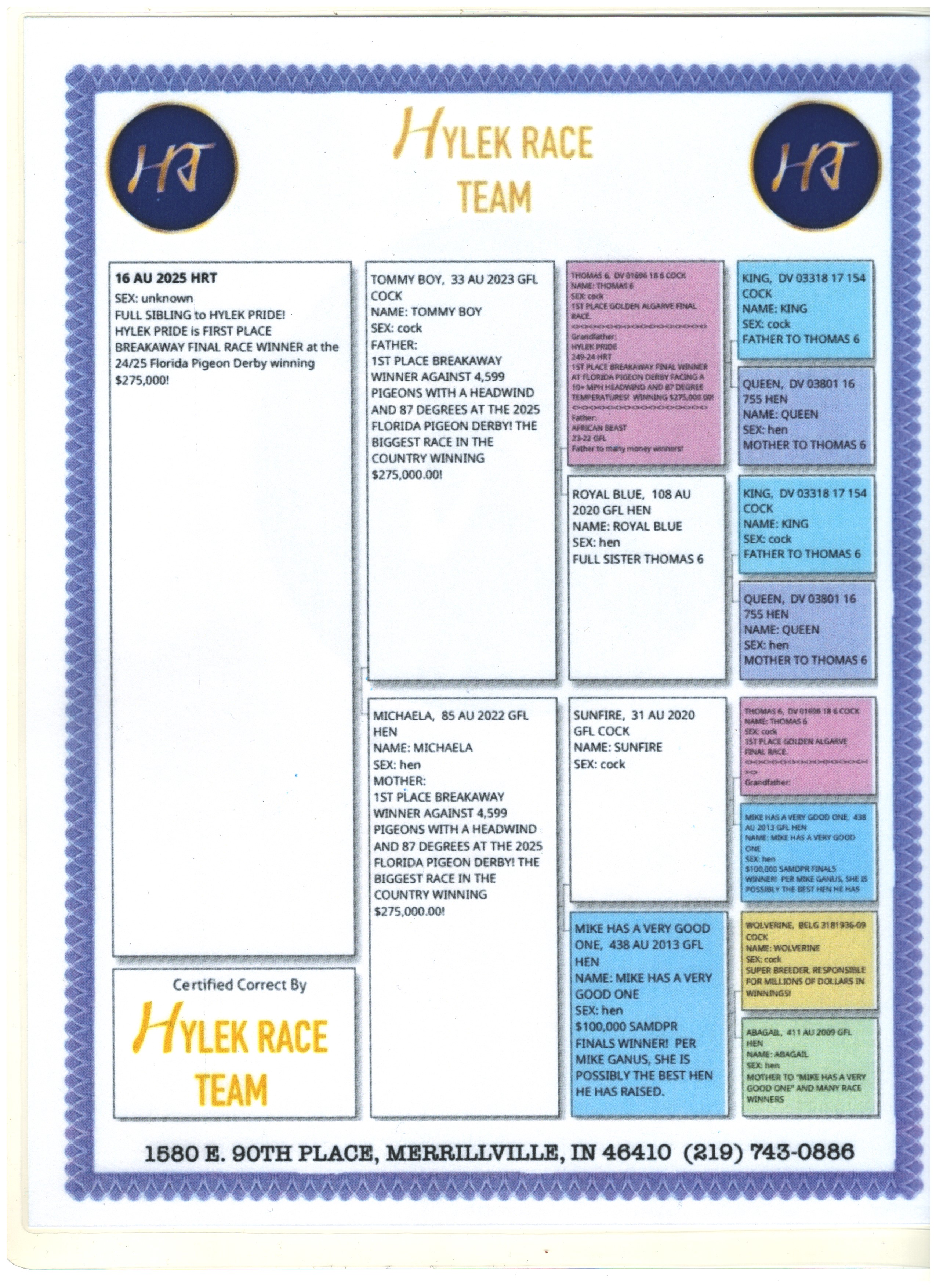 We are proud to offer a full sister to HYLEK PRIDE, the 2024/2025 Florida Pigeon Derby 1st Place Final Race Breakaway Winner, earning an outstanding $275,000 and cementing his position as one of the most dominant racers in the sport.