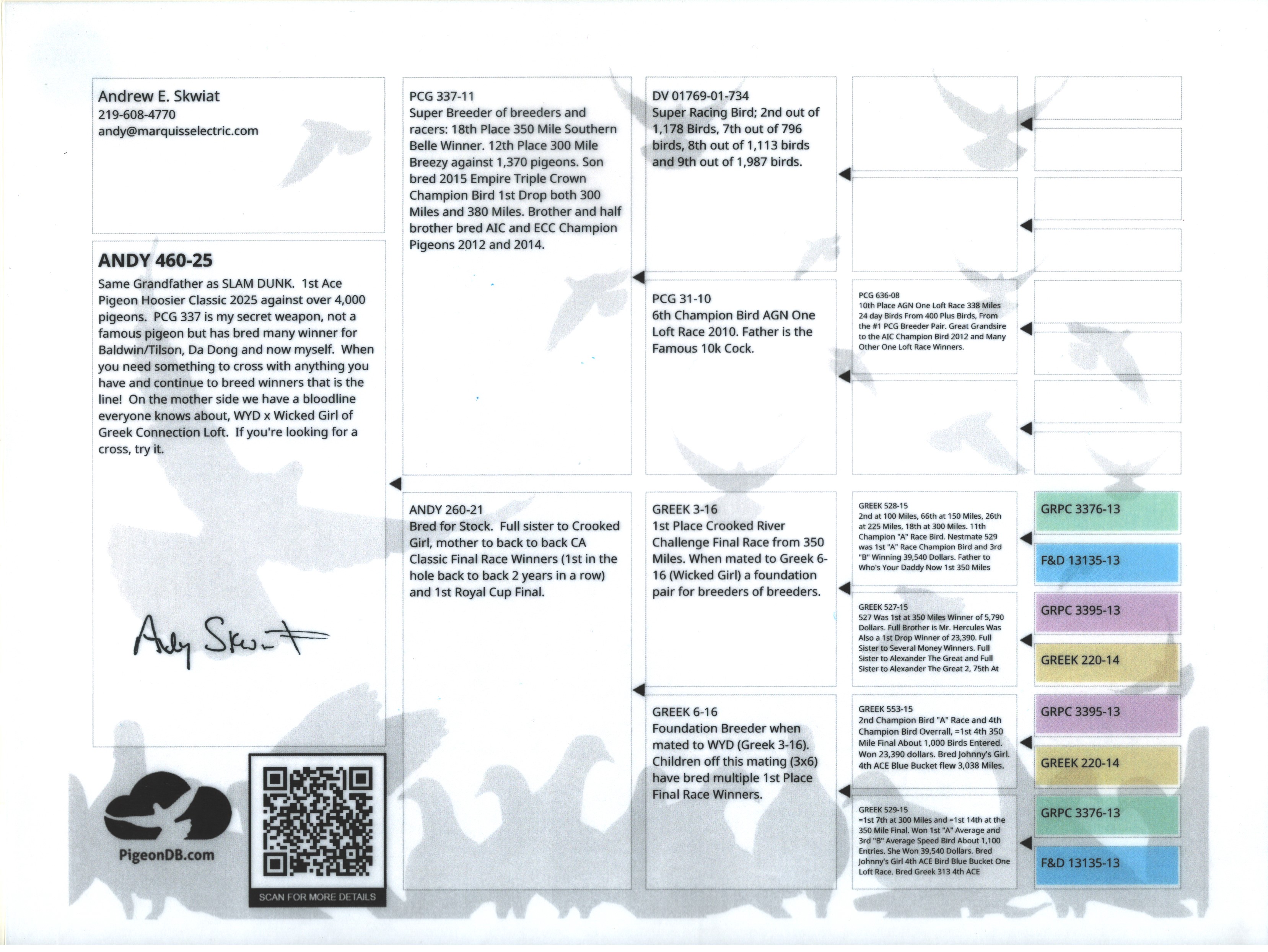 Same Grandfather as SLAM DUNK. 1st Ace Pigeon Hoosier Classic 2025 against over 4,000 pigeons. PCG 337 is my secret weapon, not a famous pigeon but has bred many winner for Baldwin/Tilson, Da Dong and now myself. When you need something to cross with anthiny you have and continue to breed winners that is the line! On the mother side we have a bloodline everyone knows about, WYD x Wicked Girl of Greek Connection Loft. If you're looking for a cross, try it.
