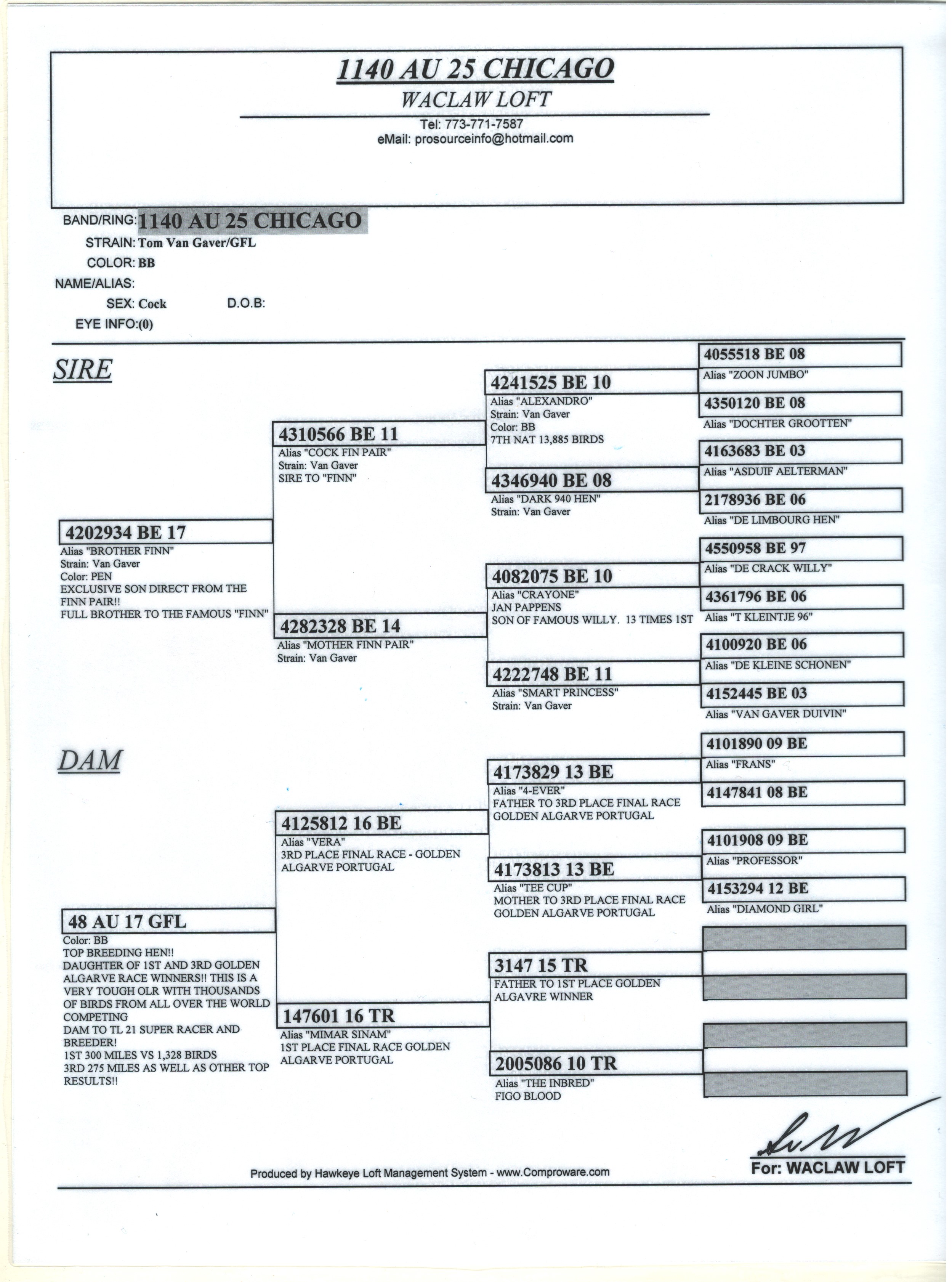 DAM – “GFL 48” SHE IS A DAUGHTER OF 1ST PLACE MATED TO 3RD PLACE WINNERS IN THE GOLDEN ALGARVE OLR!! IN HER FIRST YEAR BREEDING SHE BRED 1ST 300 MILE VS 1,328 BIRDS AND 3RD 275 MILES!! HER DAUGHTER IS NOW A TOP BREEDING HEN IN MY LOFT!!