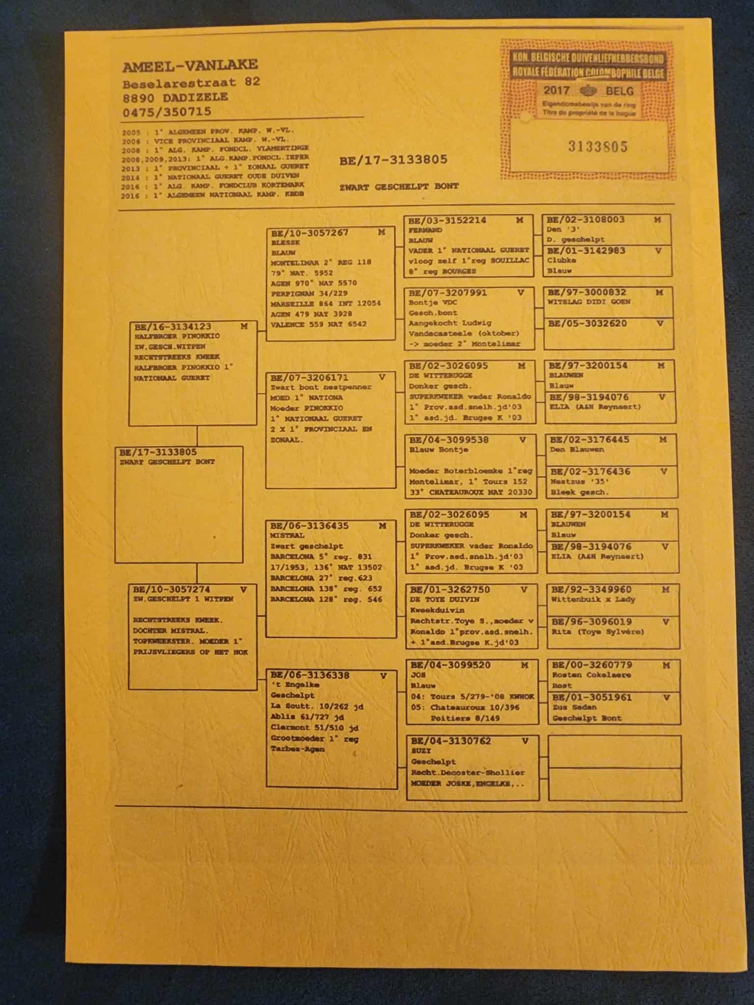 Direct Ameel-Vanlake. From "THE 123", h.brother "Pinokkio", 1e Nat. Gueret, son "Blesse", 79e Nat. Montelimar, son "Fernand", sire to 1 Nat. Gueret & "The 171", dam to "Pinokkio", 1e Nat., 2x 1e Prov. x "THE 274", daughter "Mistral" 136e Nat. Barcelona 13.502p. & "Het Engelke".