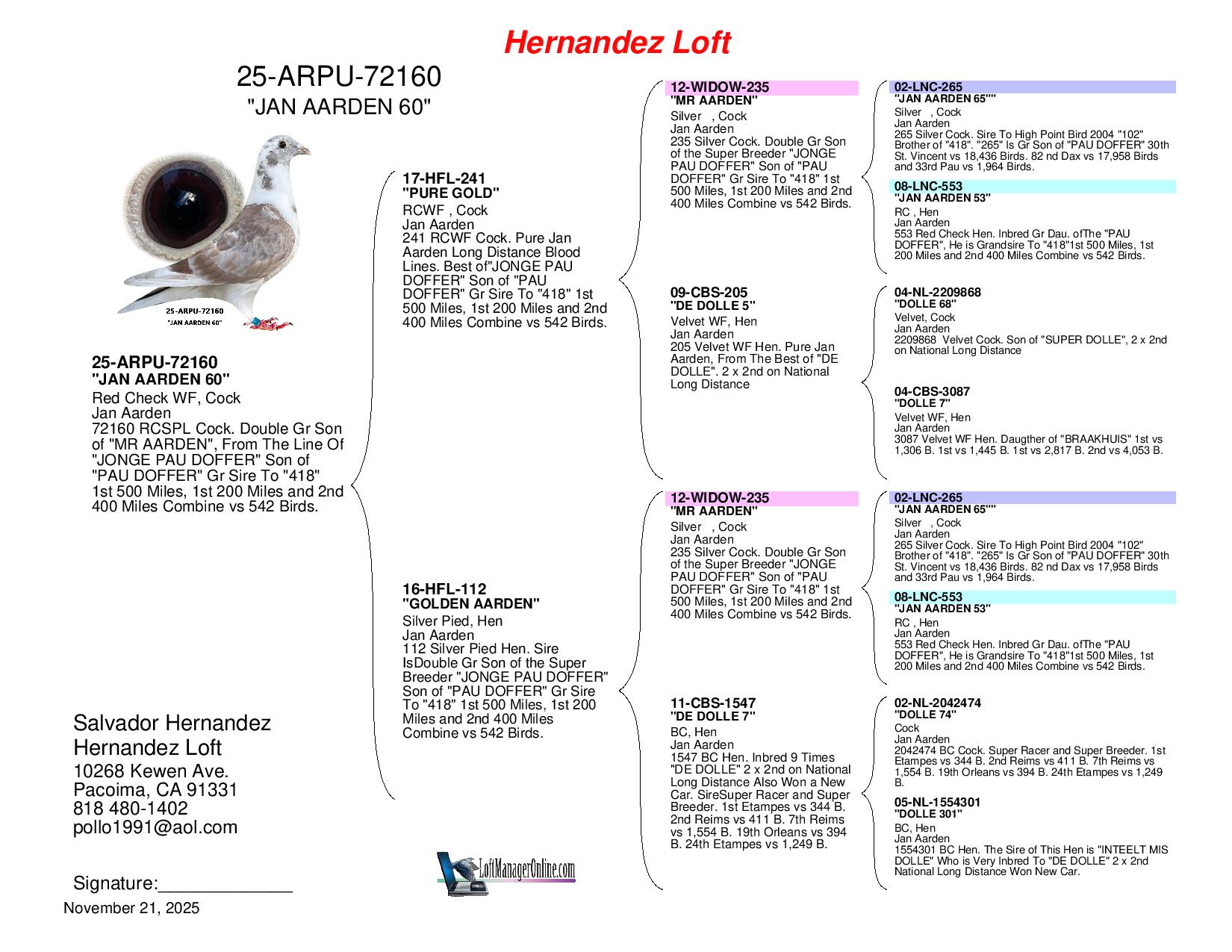 25-ARPU-72160 Red Check WF Cock. Double Gr Son of "MR AARDEN", From The Line Of "JONGE PAU DOFFER" Son of "PAU DOFFER" Gr Sire To "418" 1st 500 Miles, 1st 200 Miles and 2nd 400 Miles Combine vs 542 Birds.