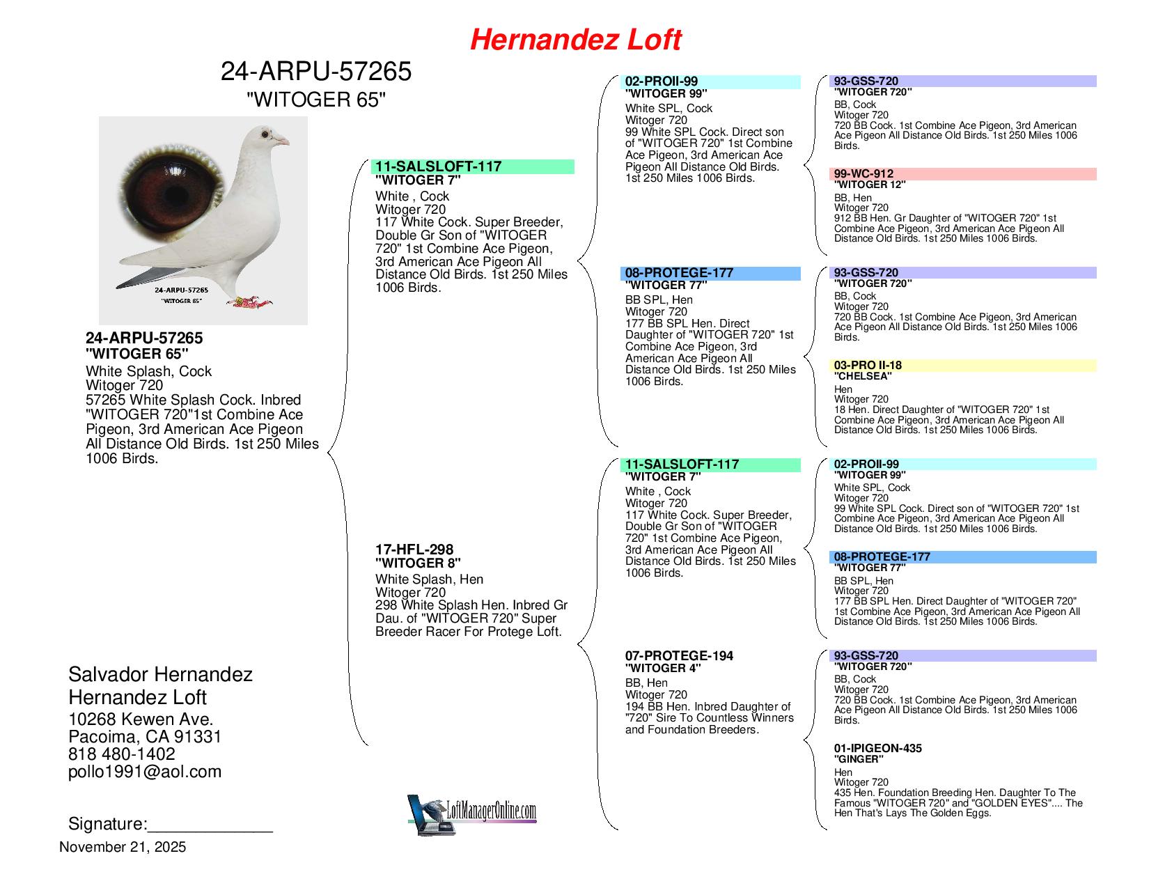 25-ARPU-57265 White Splash Cock. Inbred "WITOGER 720" 1st Combine Ace Pigeon, 3rd American Ace Pigeon All Distance Old Birds. 1st 250 Miles 1006 Birds.