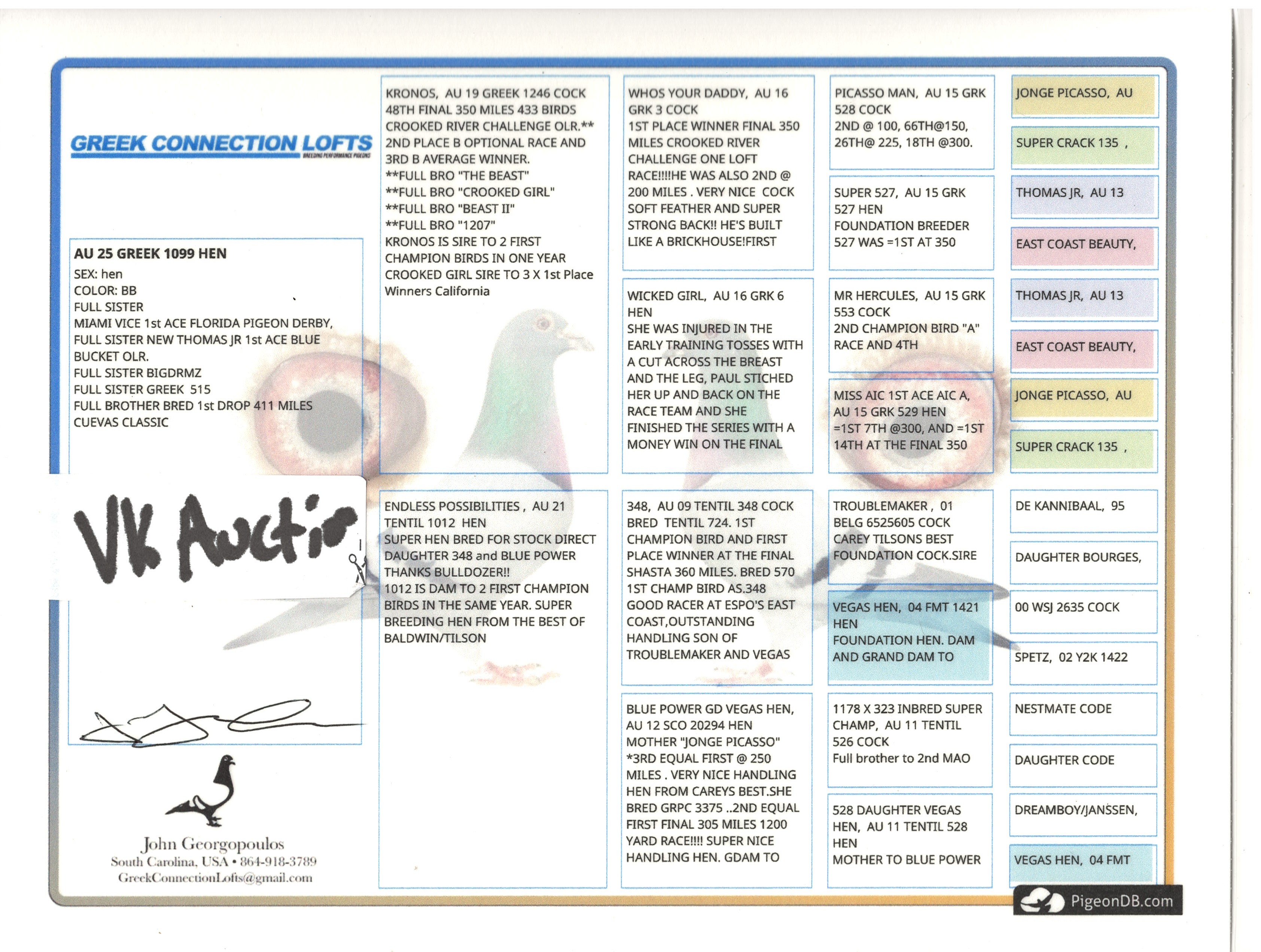 SIRE: "KRONOS" GREAT RACER AND SUPER BREEDER OF RACERS AND BREEDERS, SIRE TO "NEW THOMAS JR" 1ST ACE BLUE BUCKET , SIRE TO "MIAMI VICE" 1ST ACE FLORIDA PIGEON DERBY, SIRE TO "BIGDRMZ" =1ST CROOKED RIVER 300 AND SUPER BREEDER, SIRE TO GREEK 515, ANOTHER FULL SIBLING JUST SCORED 56TH =1ST AT THE USA DERBY VS 3558 BIRDS.