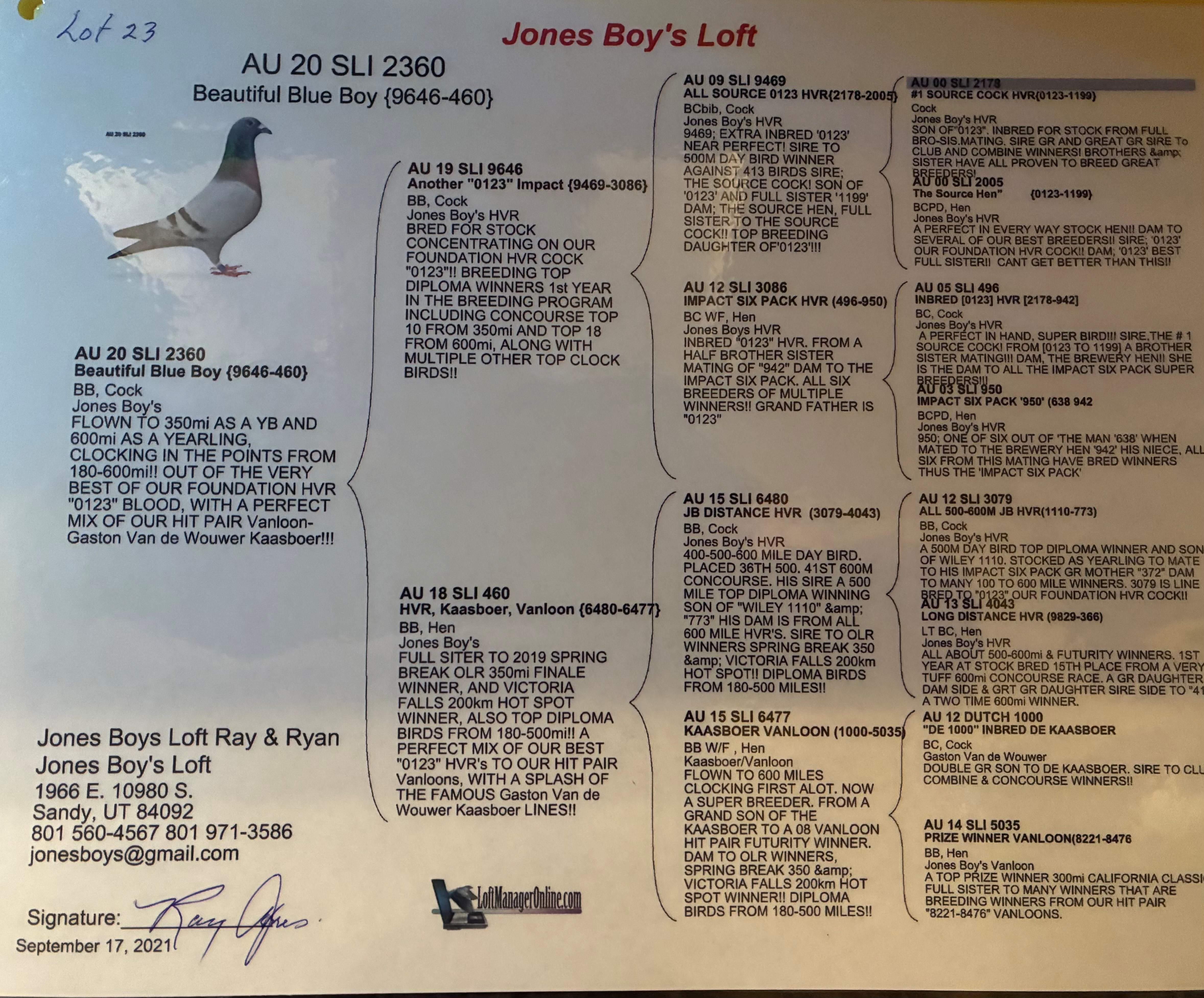 AU 20 SLI 2360 BEAUTIFUL BLUE BOY STRONG WING JONE’S BOY’S FLOWN TO 350mi AS A YB AND