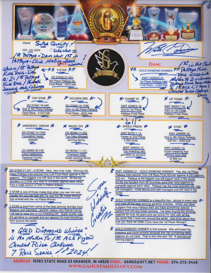 Gold Diamond Winner Also bred in 2024 the 1st Ace Pigeon Crooked River Winner~!!