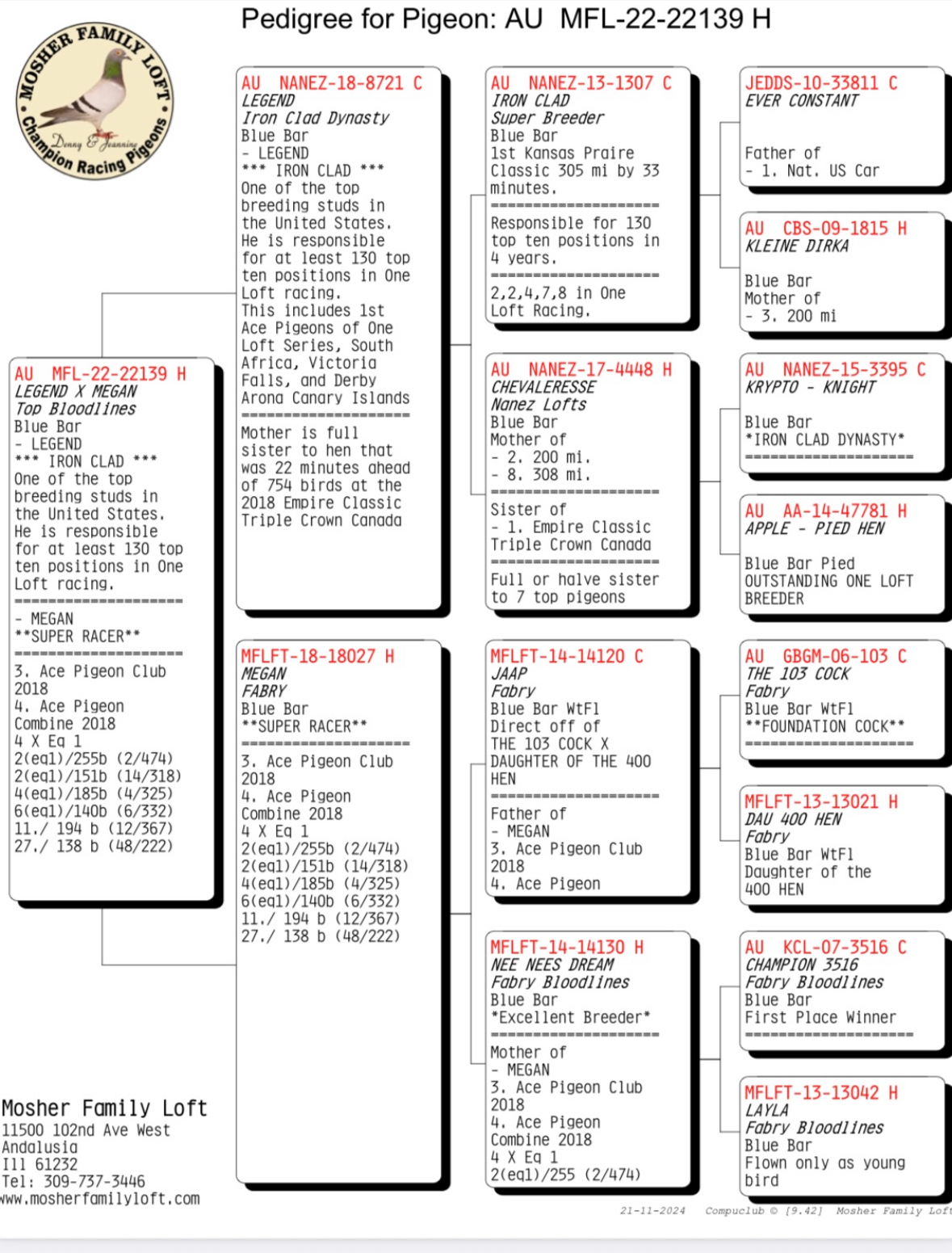 Iron Clad Dynasty. One of the succesful breed in the USA by Nanes Family Loft. AU 22 MFL 22139 BBH winning blood line. Excellent body confirmation for breeding hen. I have too many stock birds, this bird had never been bred. Buyer won't be disappointed with this nice hen.