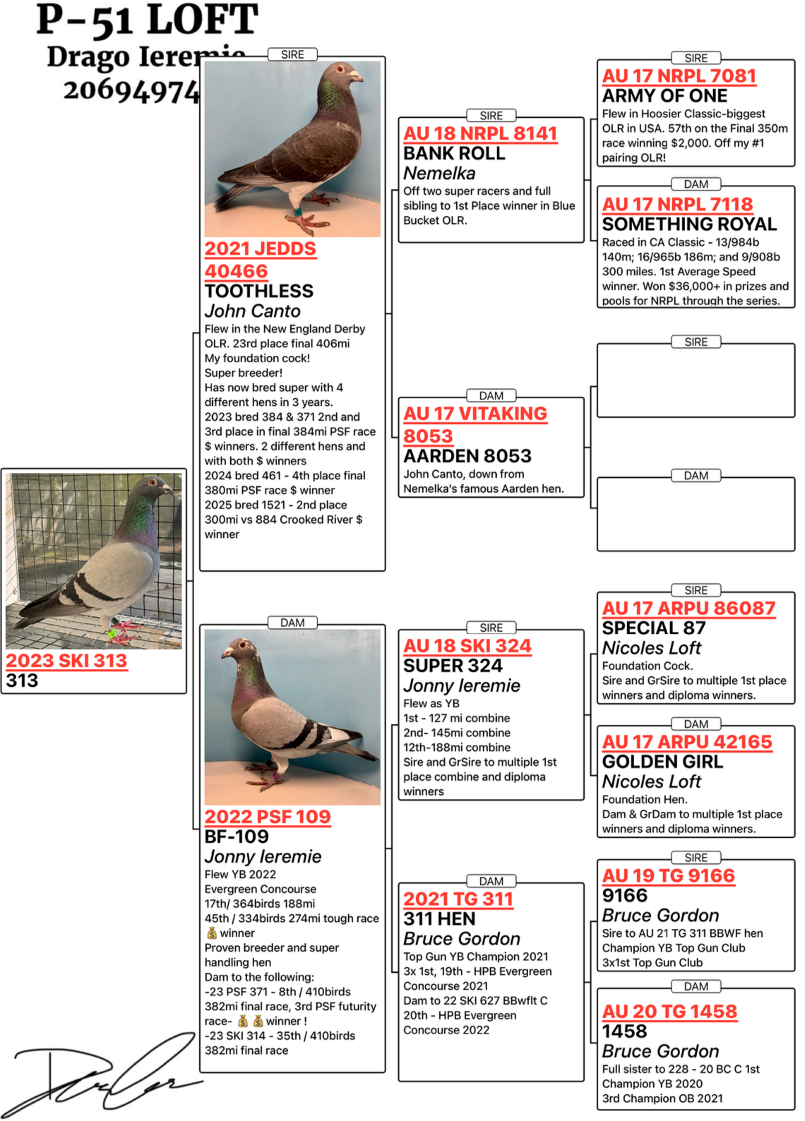 2023 cock bird in excellent health, he is a full medium cock bird. Long cast, very nice long flights, super muscle, very balanced and super handling pigeon. 313 was raced out to 380mi as a yb in the Evergreen concourse. Was one of my pigeons that I would count on and use as my pick bird. His full sister 2024 ski 371 was 3rd place in the PSF final 380mi race $ winner. Half bro 384 2nd place 380mi PSF final race. Half sister 461 4th 380mi PSF final race. Half brother 1521 (same father) was 2nd place 300mi 2025 Crooked River OLR. He is direct out of my foundation super breeder Toothless. Has bred me money winners and top pigeons in the last 3 years with different hens each year. I have too many birds and I must cut down. Only room for 12 pairs MAX. Will possibly upload video later this week. I will be posting a few birds in the next coming weeks. Some proven and some late hatches. I have gone thru and culled all birds that didnt prove themselves in resuslts or handle to my expectation/criteria. 2069497417