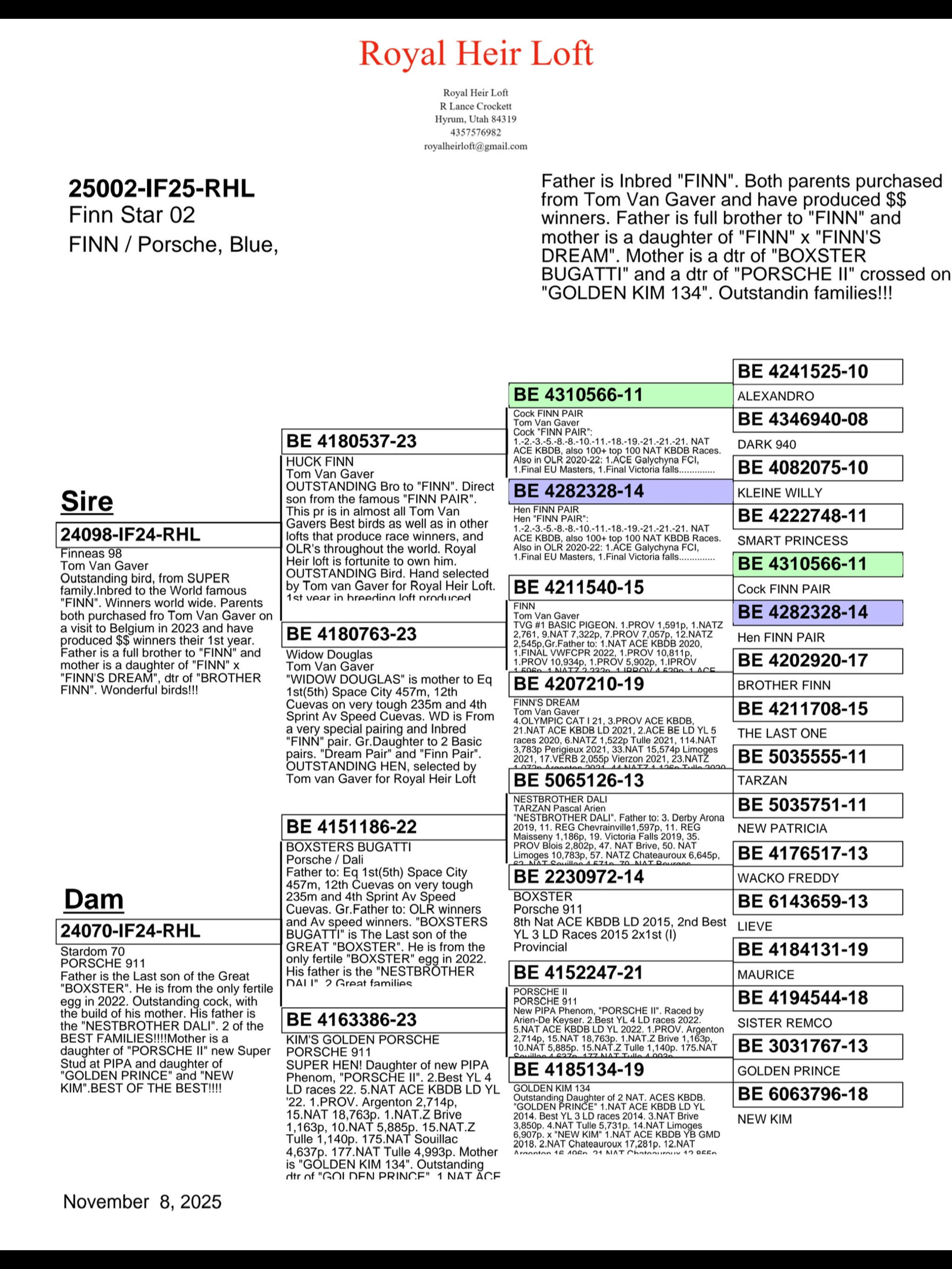 Mother is from our “BOXSTER BUGATTI”, the Last son of the Great "BOXSTER". He is from the only fertile egg in 2022. Outstanding cock, and father to Equal 1st in Space City 450 mile (Black Gold extra race) His father is the "NESTBROTHER DALI". Mother is a daughter of "PORSCHE II" new Super Stud at PIPA and daughter of "GOLDEN PRINCE" and "NEW KIM". BEST OF THE BEST!!!!