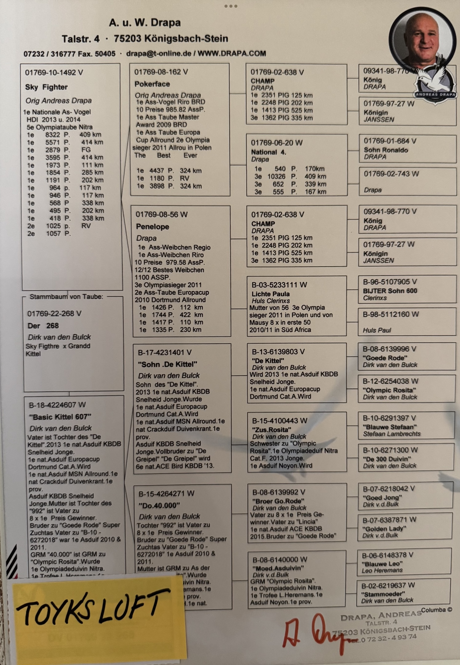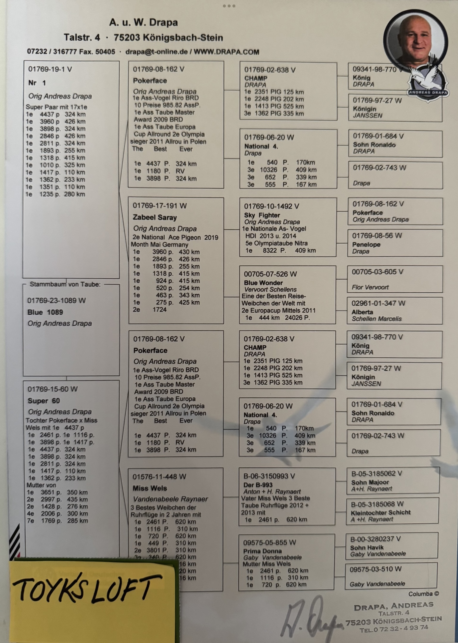 Toyks loft has recently import some excellent birds from Drapa. This bird is from some of the best Pokerface over the world famous Kittle. This is your opportunity to get some very inbred Drapa bloodlines. This bird is still young and the tail has to finish its moult.