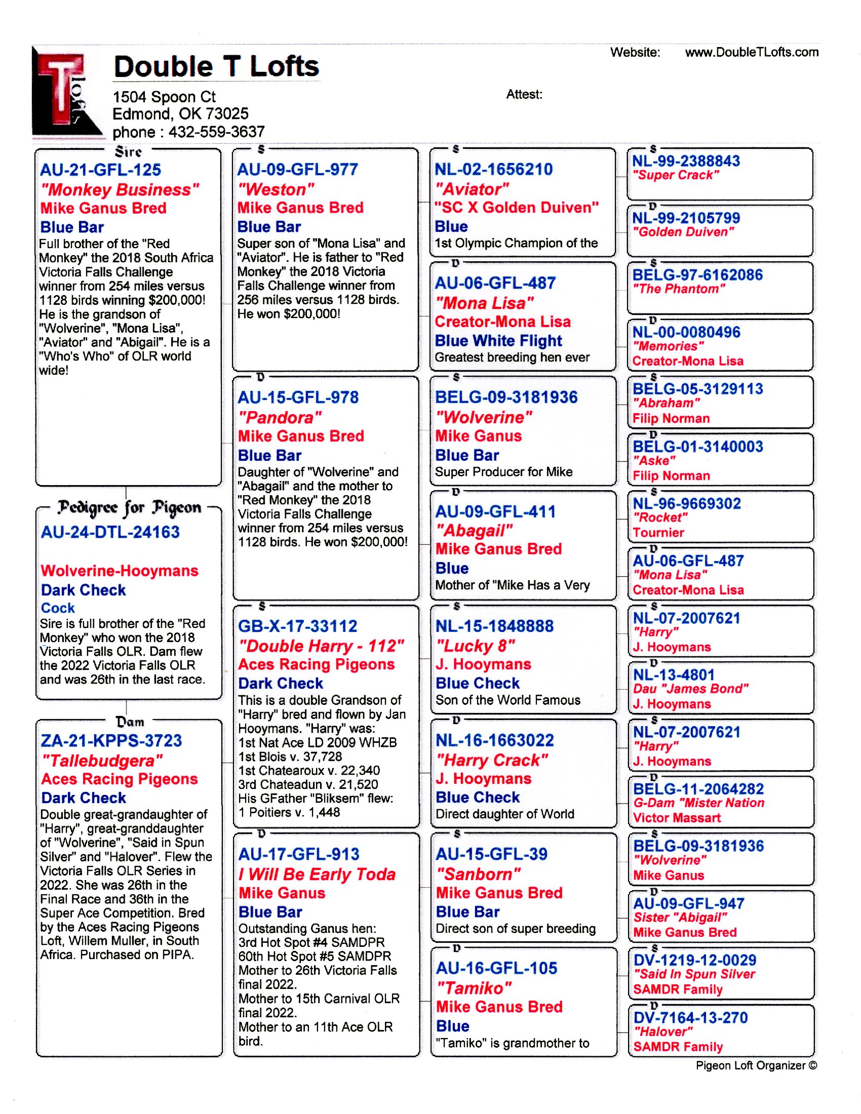 Dam: ZA-21-KPPS-3723 “Tallebudgera” – Bred in South Africa, she is an excellent double G-Granddaughter of Hooyman’s super flyer and breeder “Harry” and a G-Granddaughter of “Wolverine”. She flew the 2022 Victoria Falls OLR and was 26th in the final race and 36th in the Super Ace competition. One daughter was E1 in 2024 YBs for DTL.