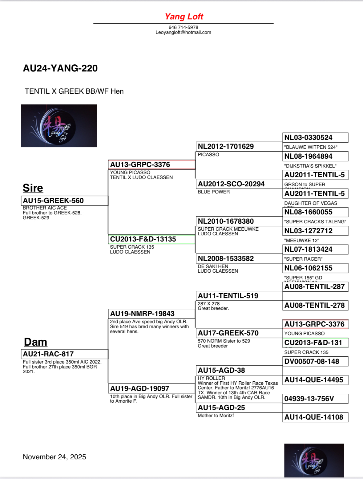 Super nice hen, Best GREEK X TENTIL. Check out of the pedigree. Thanks!