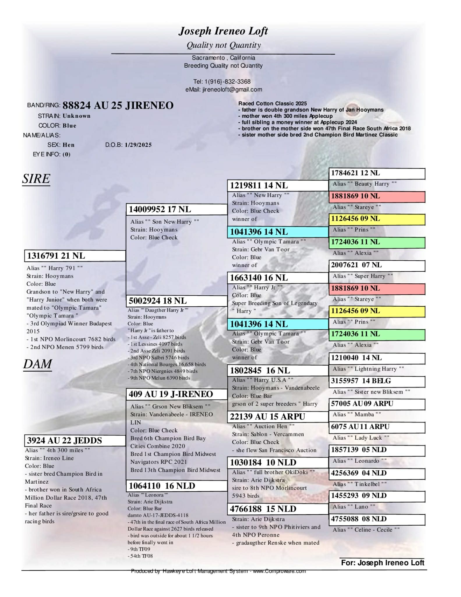 This is some of Joseph's foundation bloodline. His loft has been very successful with this bloodline and crosses of Harry. Don't miss this opportunity. This bird flew at the Cotton Classic 2025.