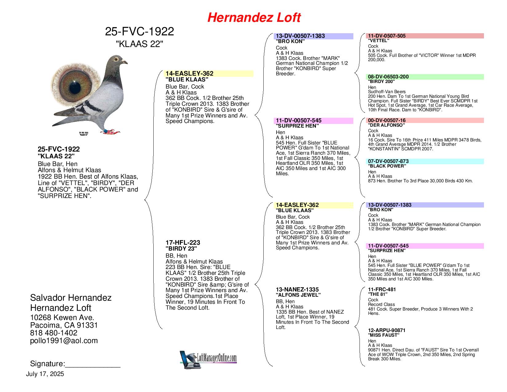 25-FVC-1922 BB Hen. Best of Alfons Klaas, Line of "VETTEL", "BIRDY", "DER ALFONSO", "BLACK POWER" and "SURPRIZE HEN" Full Sister "BLUE POWER" G'dam To 1st National Ace, 1st Sierra Ranch 370 Miles, 1st Fall Classic 350 Miles, 1st Heartland OLR 350 Miles, 1st AIC 350 Miles and 1st AIC 300 Miles.