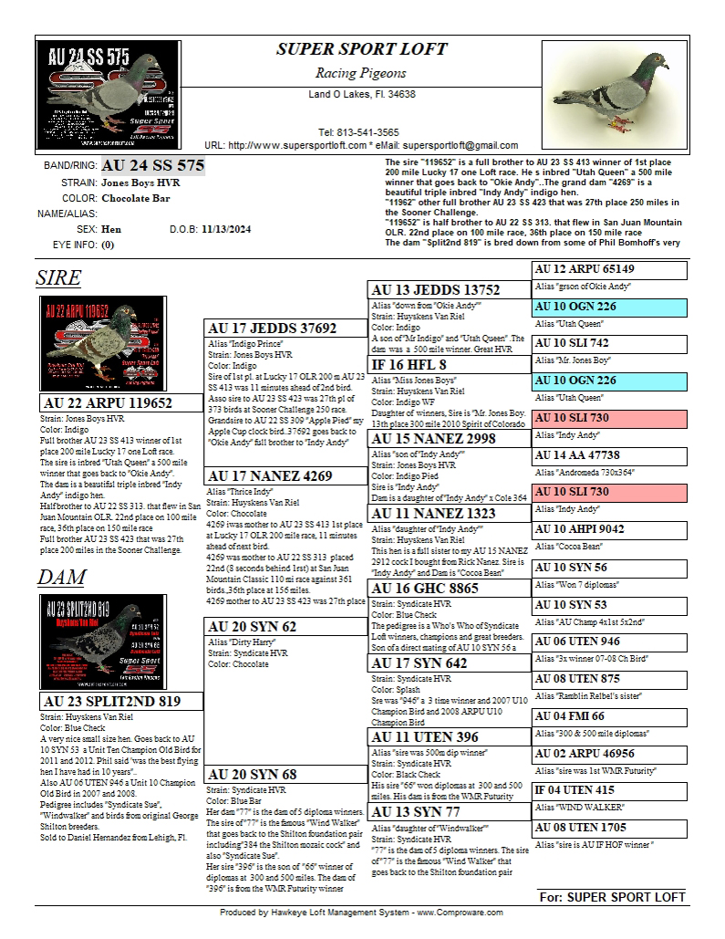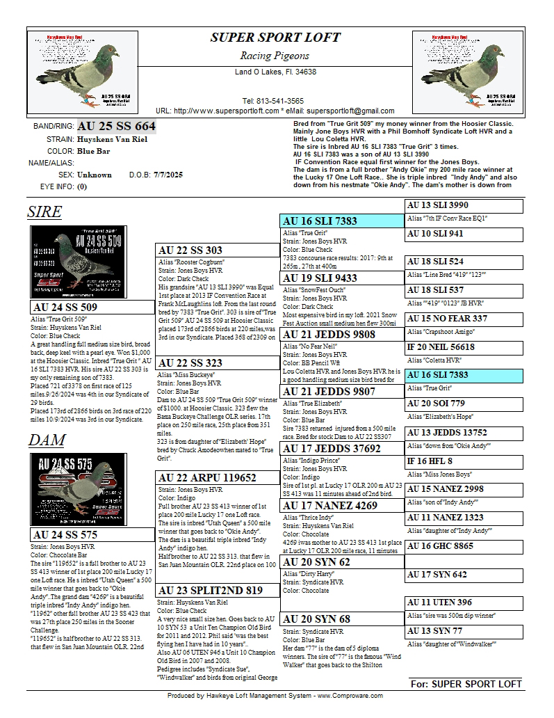 Bred from "True Grit 509" my money winner from the Hoosier Classic. Mainly Jone Boys HVR with a Phil Bomhoff Syndicate Loft HVR and a little Lou Coletta HVR.