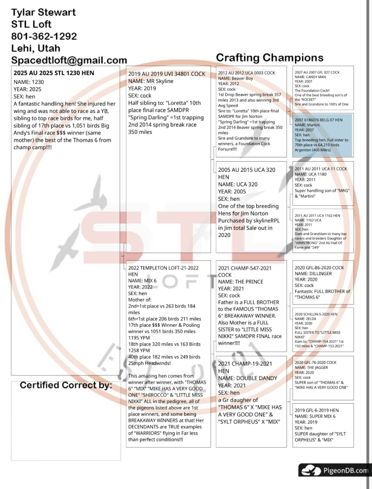 Great donation giving by STL loft. He has been hitting with his birds everywhere the past couple years. This is a great combo of winning bloodlines.