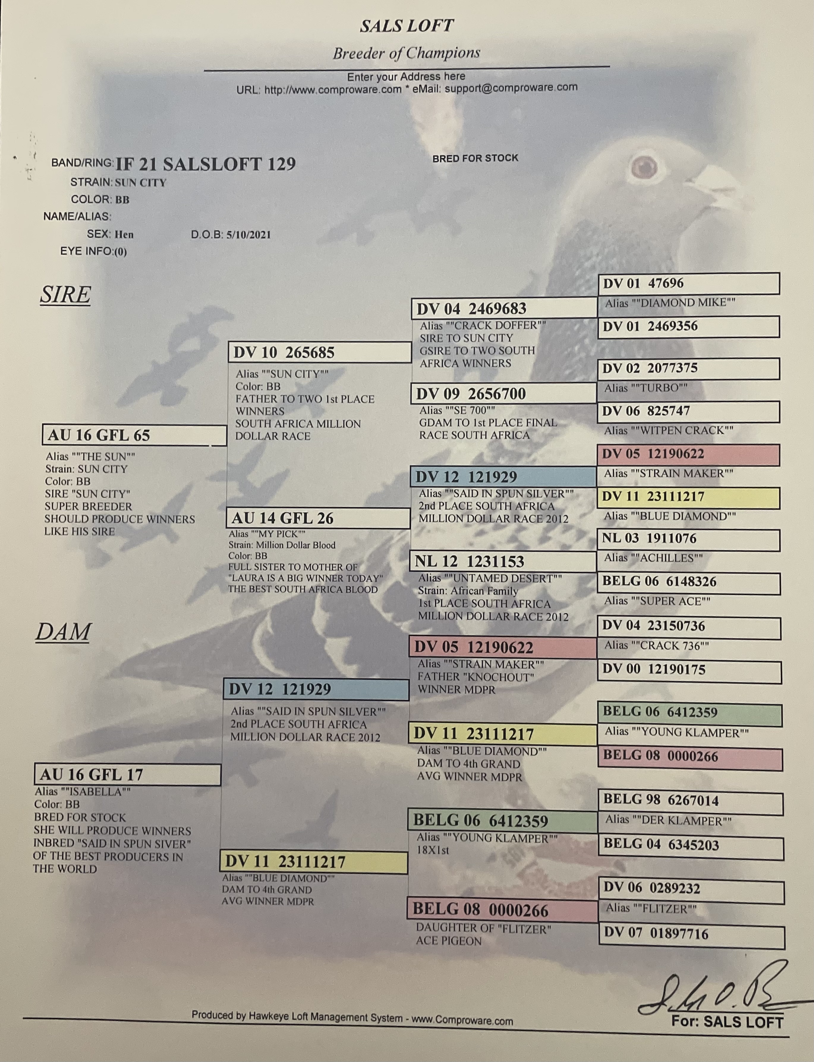 Nice hen! Sire is GFL 65 - son of SUN CITY x MY PICK (sister to mother of Laura is a Big Winner Today!). Dam is GFL 17 - daughter of SAID IN SPUN SILVER x BLUE DIAMOND (mother/son pairing). See pedigree! Good bird not the best picture. Text with questions. 805-766-4082