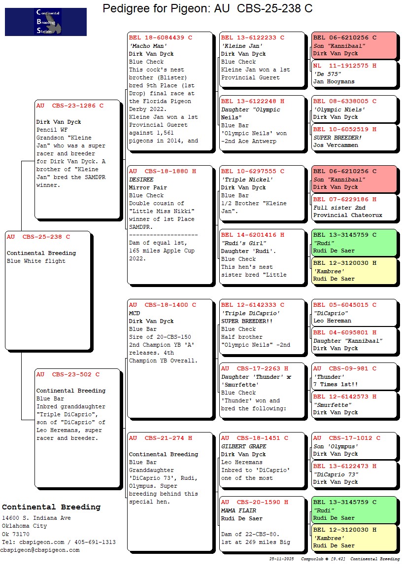 Dam: Inbred granddaughter "Triple DiCaprio", son of "DiCaprio" of Leo Heremans, super racer and breeder.