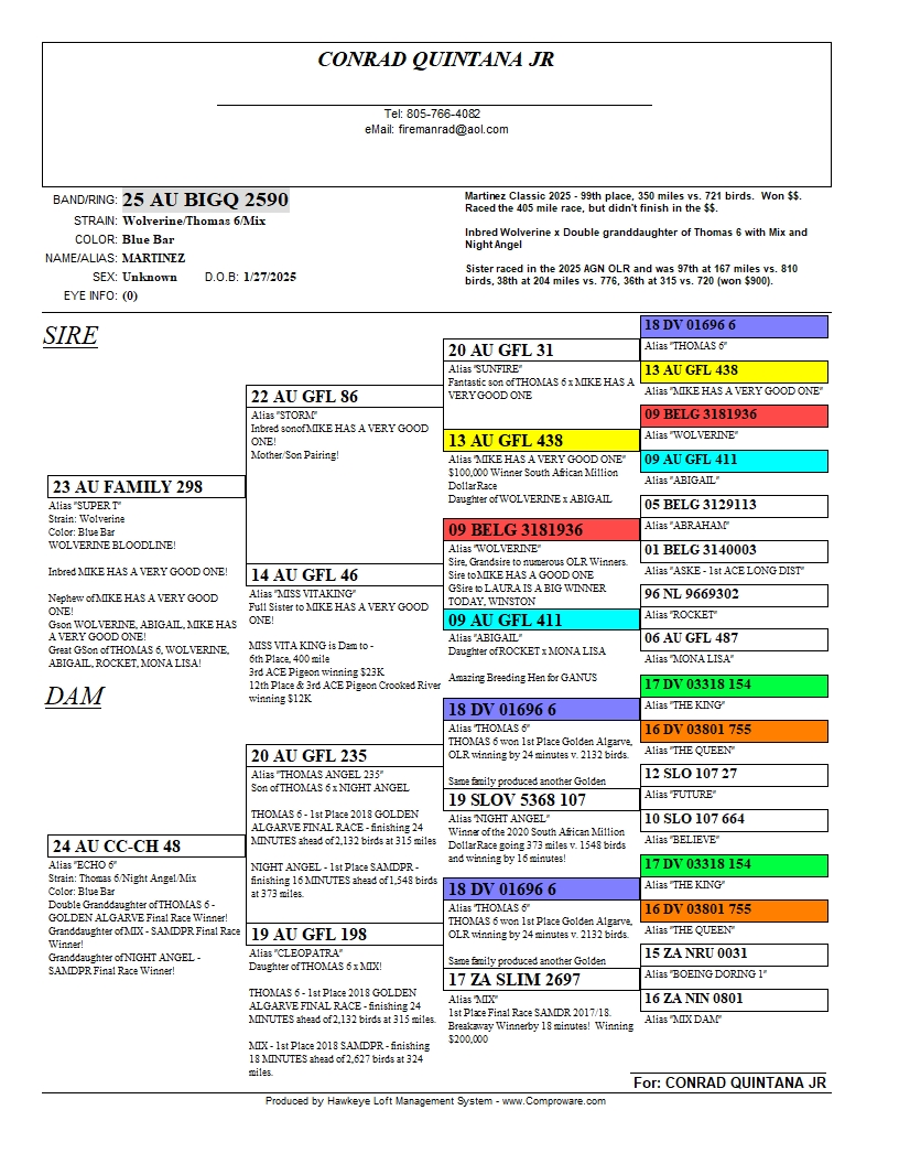 Raced in the 2025 Martinez Classic under Celine's Loft Team. On November 1st, she was 99th in the 350 mile race vs. 721 birds, winning $450! Raced the 405 mile race vs. 500 birds on November 10th and finished out of the money. I believe she was "hawked" because she is missing almost all her tail feathers. They are growing back in, but I feel she flew very well considering the difficulty of hardly any tail feathers. You can see in the picture the tail feather are still regrowing.