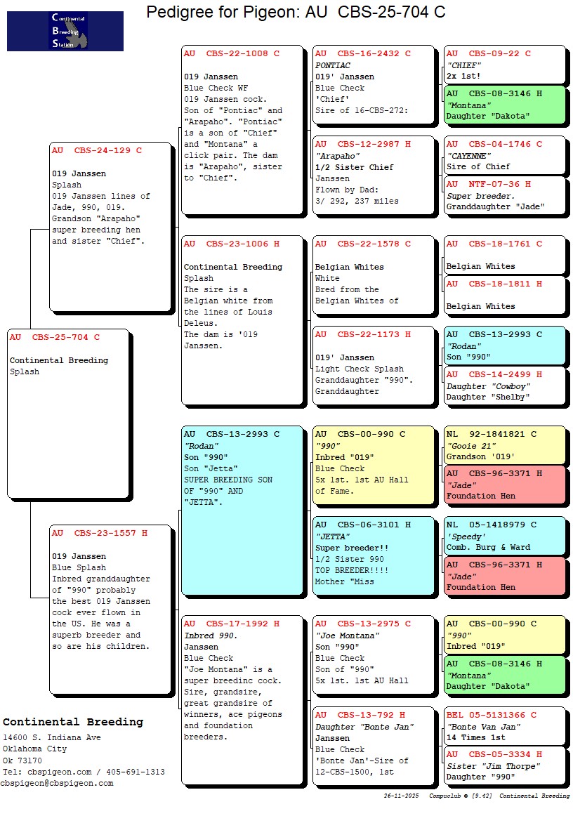 Dam: Inbred granddaughter of "990" probably the best 019 Janssen cock ever flown in the US. He was a superb breeder and so are his children.
