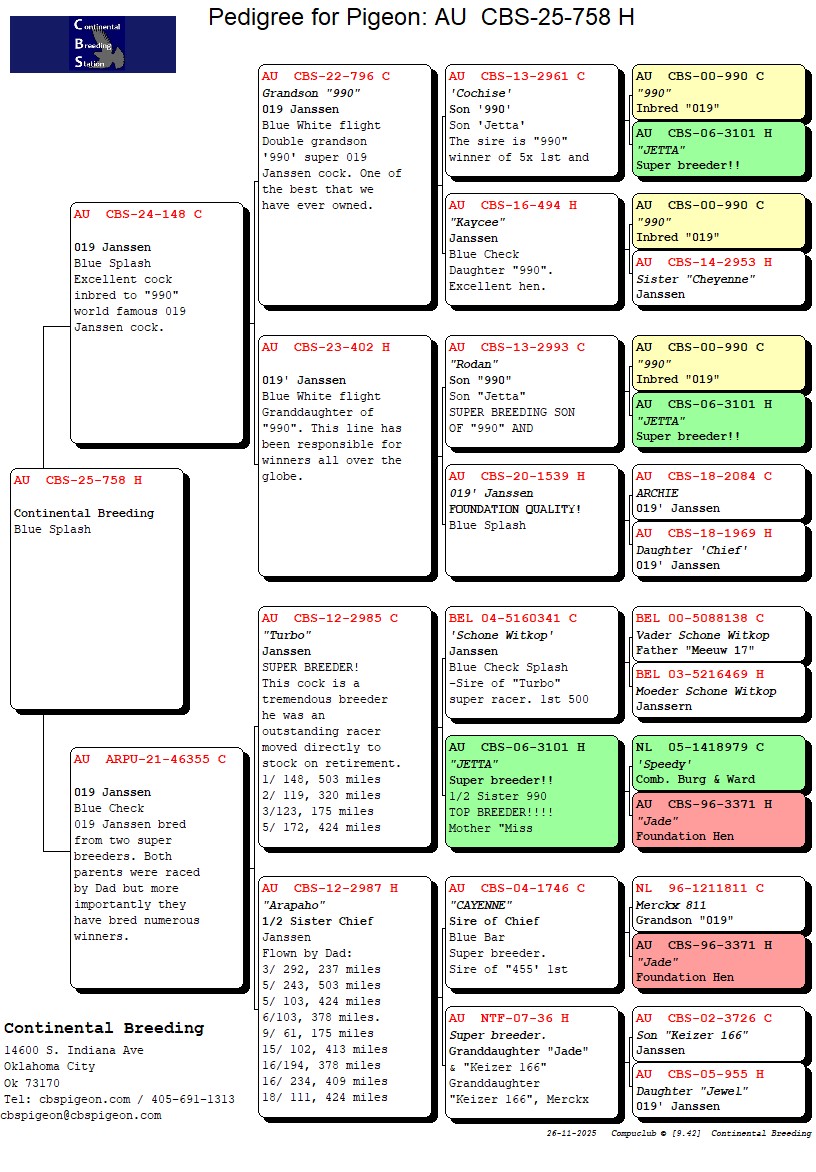 Dam: 019 Janssen bred from two super breeders. Both parents were raced by Dad but more importantly they have bred numerous winners.
