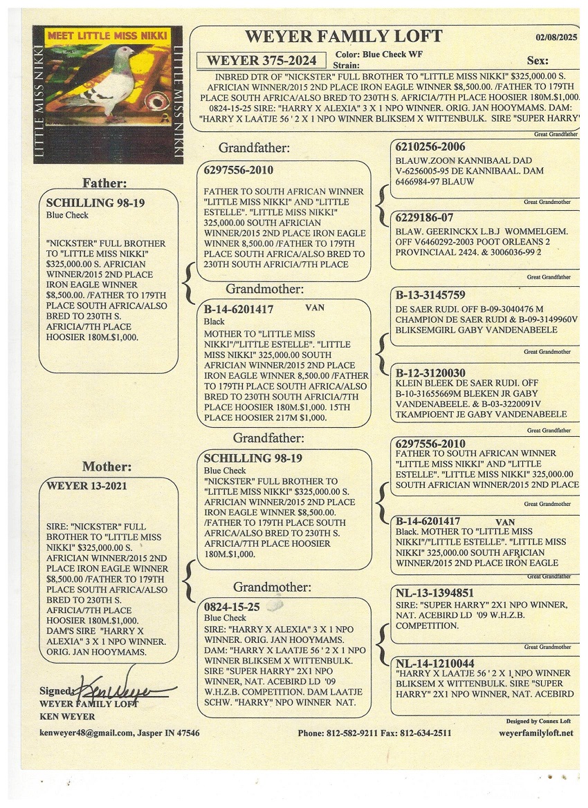 INBRED DTR OF "NICKSTER" FULL BROTHER TO "LITTLE MISS NIKKI" $325,000.00 S. AFRICIAN WINNER/2015 2ND PLACE IRON EAGLE WINNER $8,500.00. /FATHER TO 179TH PLACE SOUTH AFRICA/ALSO BRED TO 230TH S. AFRICIA /7TH PLACE HOOSIER 180M.$1,000.0824-15-25 SIRE: "HARRY X ALEXIA" 3 X 1 NO WINNER. ORIG. JAN HOOYMAMS. DAM:"HARRY X LAÄTJE 56 ' 2 X 1 NPO WINNER BLIKSEM X WITTENBULK. SIRE "SUPER HARRY" THIS IS A VERY NICE BIRD THAT WAS DONATED BY Kim Kasabuski
