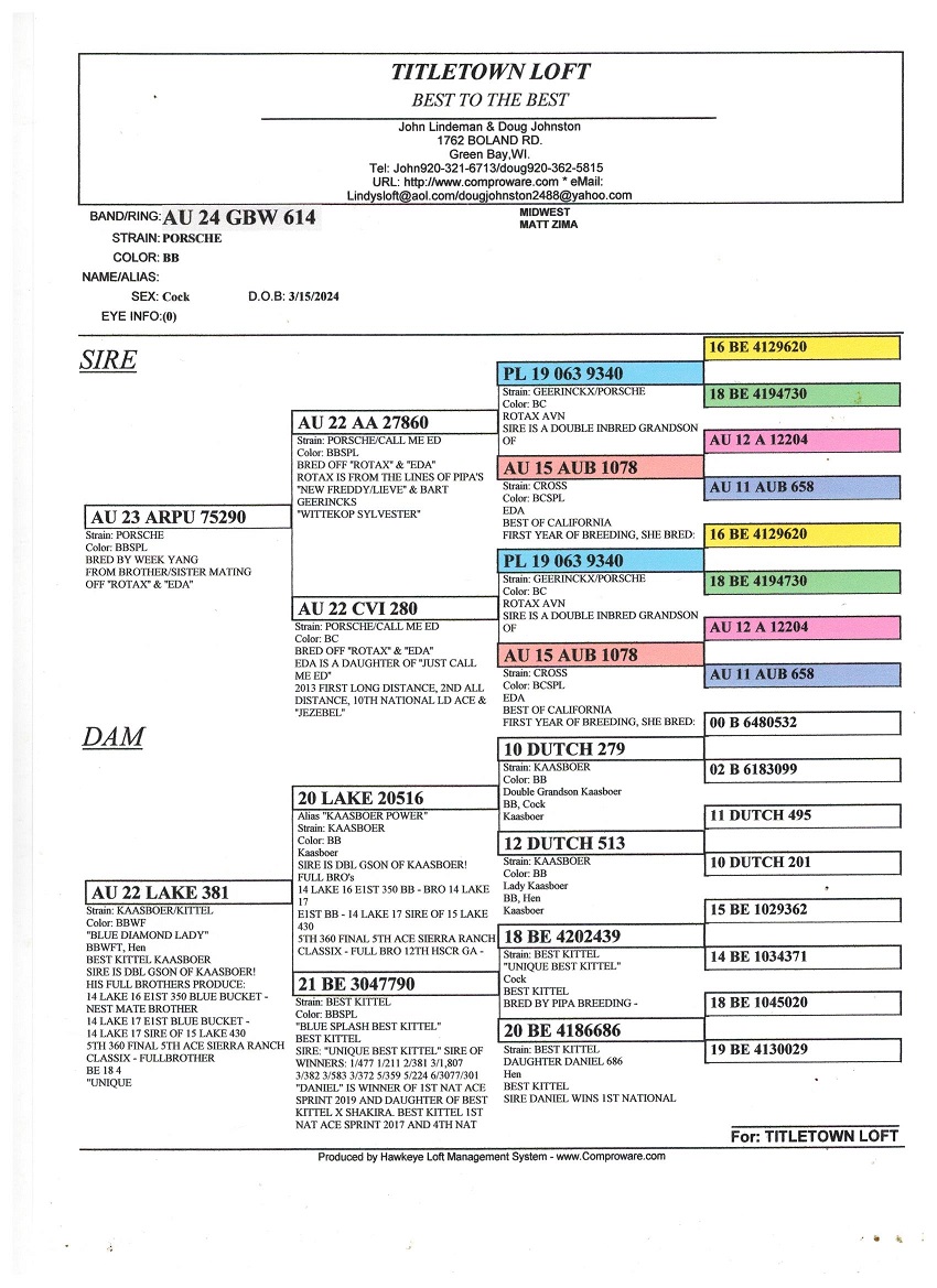 THE BIRDS LISTED ON HERE ARE DONATED BY SOME OF THE BEST FLYERS IN OUR CONCOURSE. THIS GROUP OF BIRDS ARE DONATED BY MATT ZIMA, DAN SCHINGEN, SCOTT GUELLER AND TITLETOWN LOFT. THESE BIRDS LISTED ARE VERY NICE AND SHOULD MAKE A GOOD ADDITION TO ANYONE'S LOFT.