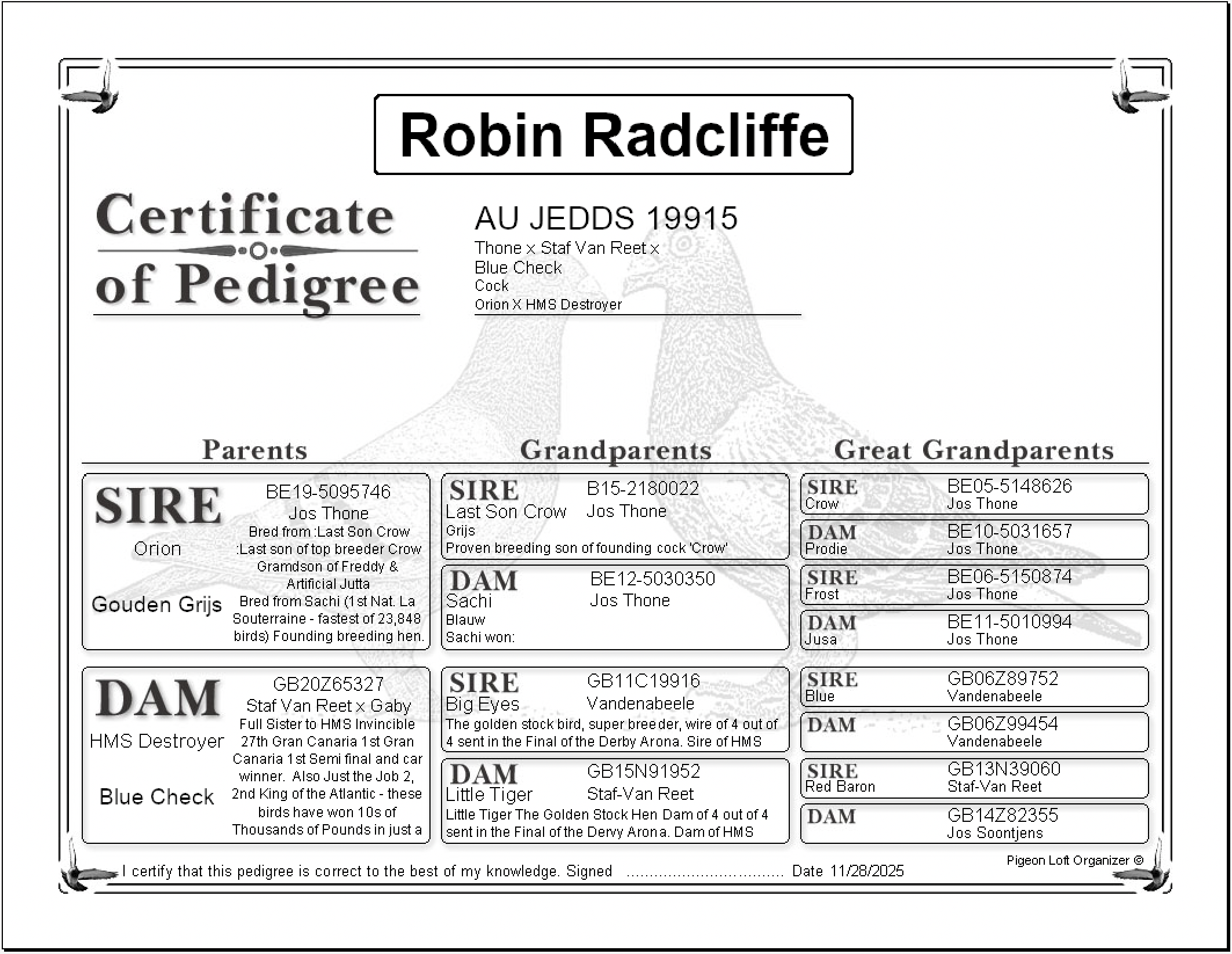 Sire: ORION (BE19-5095746) a direct import from the famous Jos Thone out of Thone's top racing hen SACHI-winner of 1st Nat. La Souterraine fastes of 23,848 birds (see Thone breeding catalog). ORION is the son of SACHI and as a yearling bred Sezanne - 1st of 792 birds at 269 km and fastest of 1,257 birds.