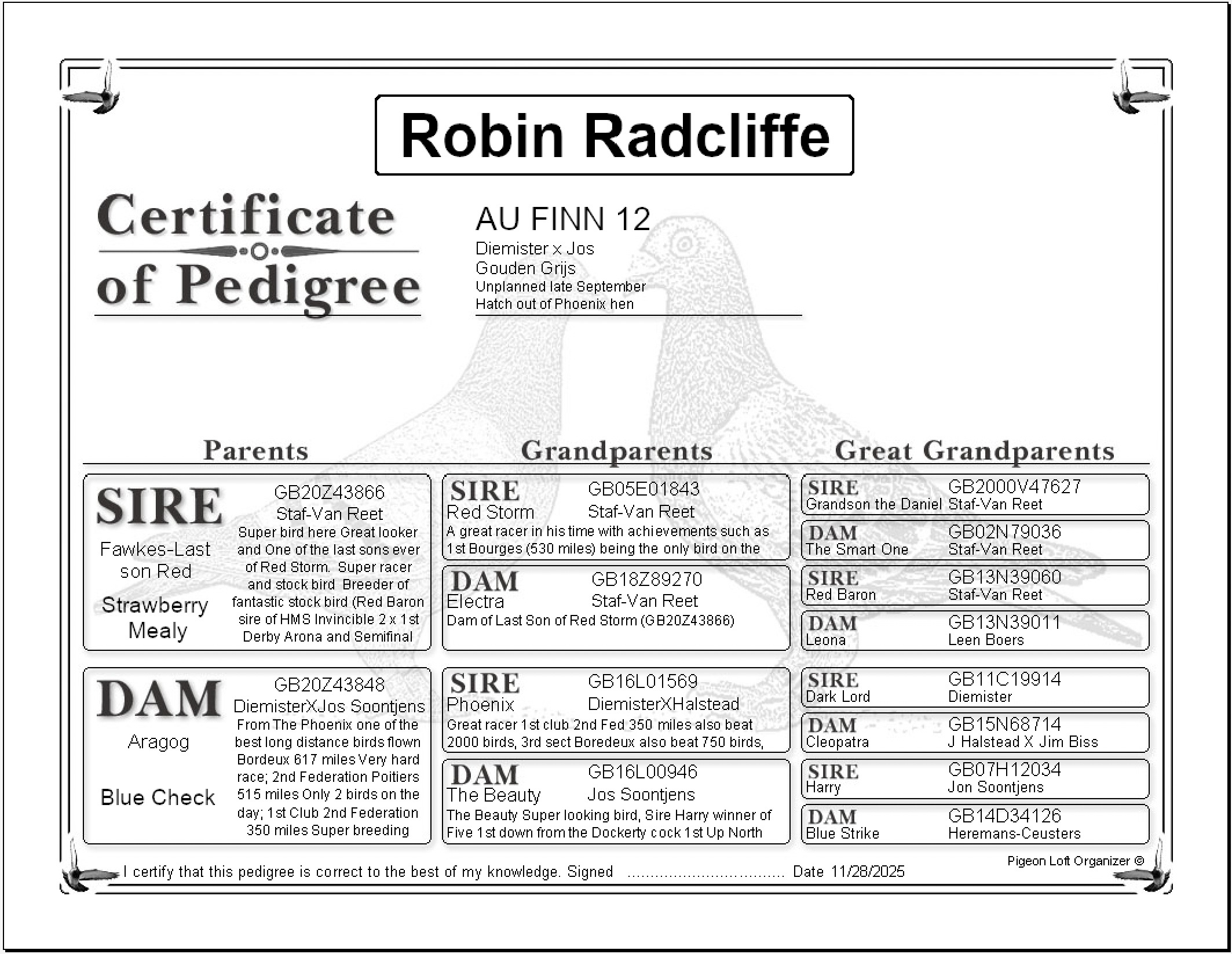 Dam: ARAGOG (GB20Z43848) DiemisterxJos Soontjens: From The Phoenix one ofthe bestlong distance birds flown Bordeux 617 miles Very hard race; 2nd Federation Poitiers 515 miles Only 2 birds on the day; 1st Club 2nd Federation 350 miles