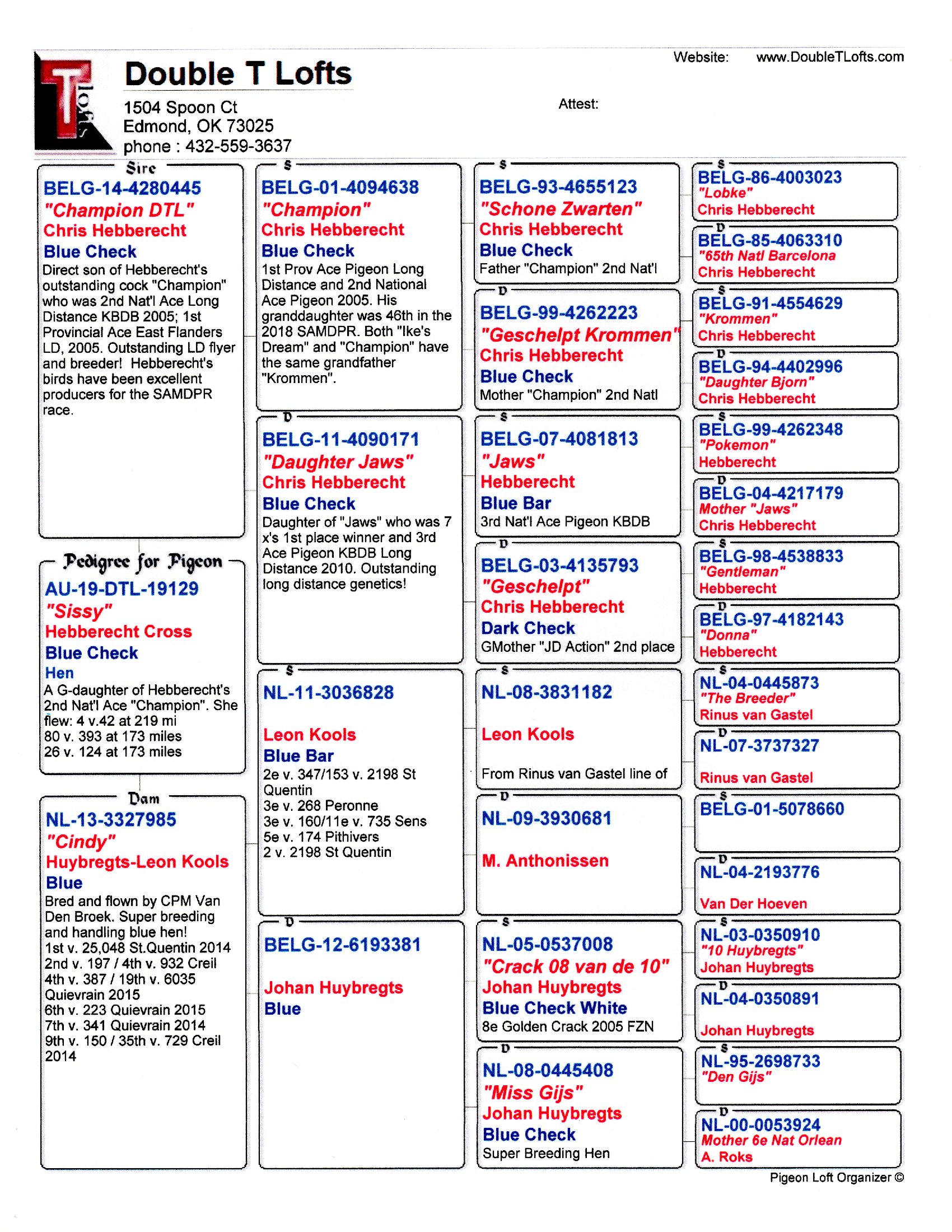 Sire: BE 14-4280445 "Champion DTL" aka "Champion's Boy". He is a direct son of Hebberecht's outstanding flyer and breeder "Champion", who was 2nd National Ace Long Distance, KBDB, and 1st Provincial Ace LD, 2005.