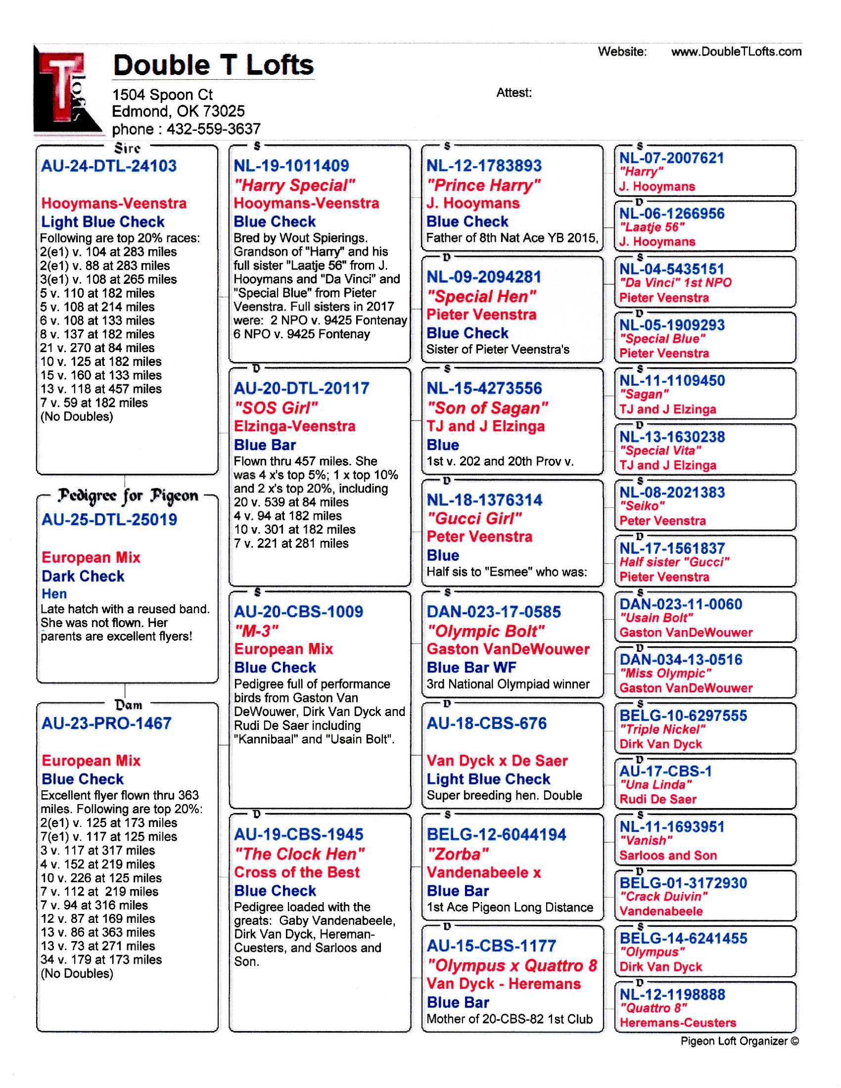 Sire: AU-24-DTL-24106 BC - He is a great-grandson of Jan Hooyman's super star "Harry". He was an excellent flyer. Following are his top 20% race positions: