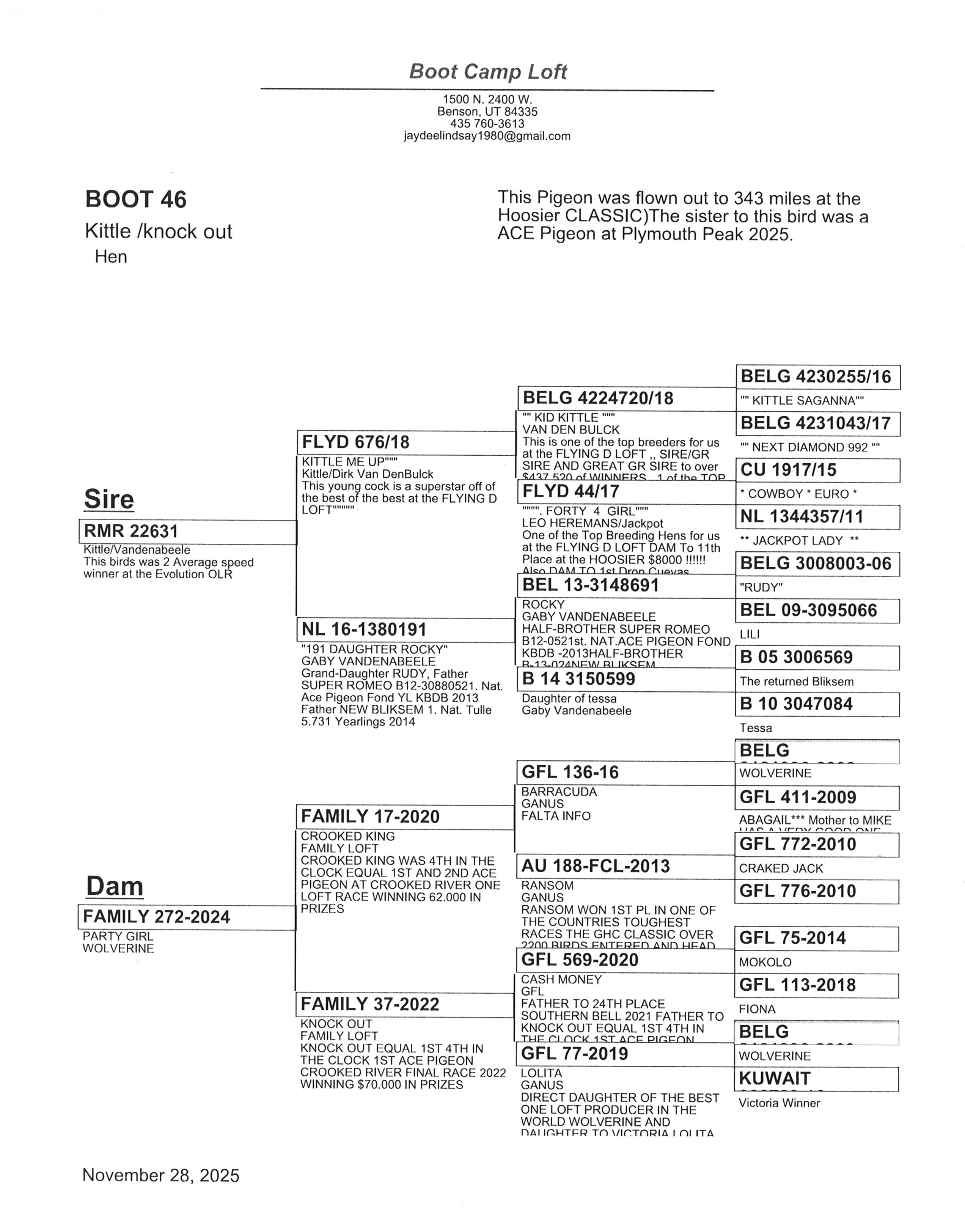BOOT 46-2025 BB Hen, flown in the Hoosier Classic 353 miles. Full sister was ACE PIGEON at Plymouth Peak 2025.