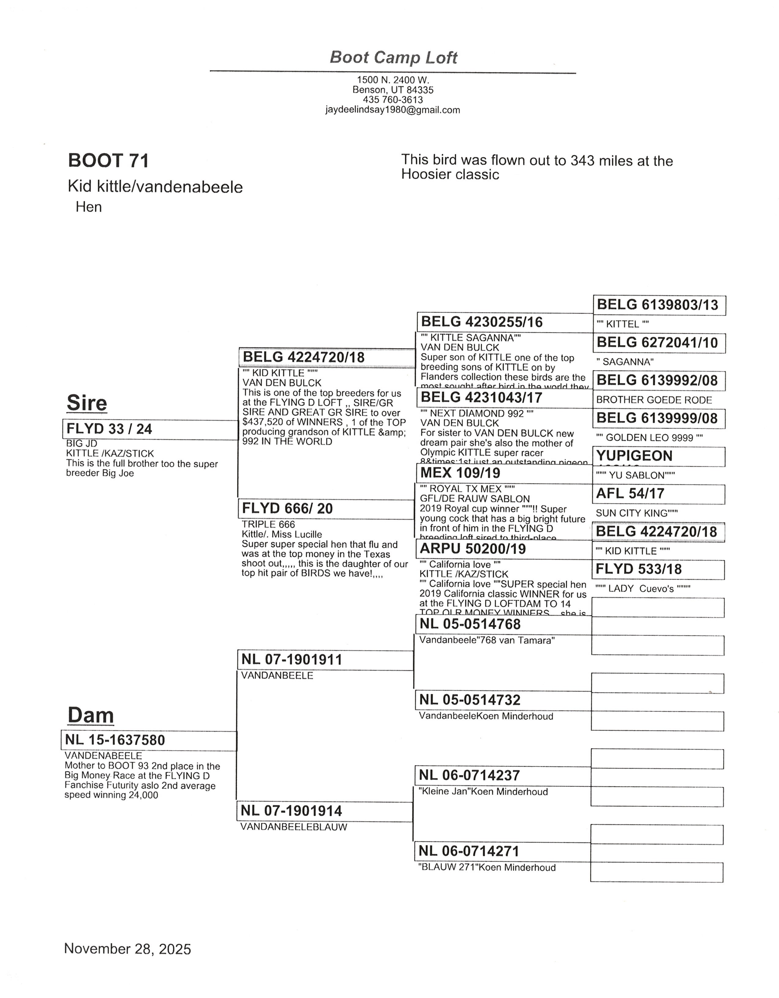 BOOT 71-2025 BB Hen, Flown 343 miles at Hoosier Classic, very strong, tight vents. Very nice small to medium hen