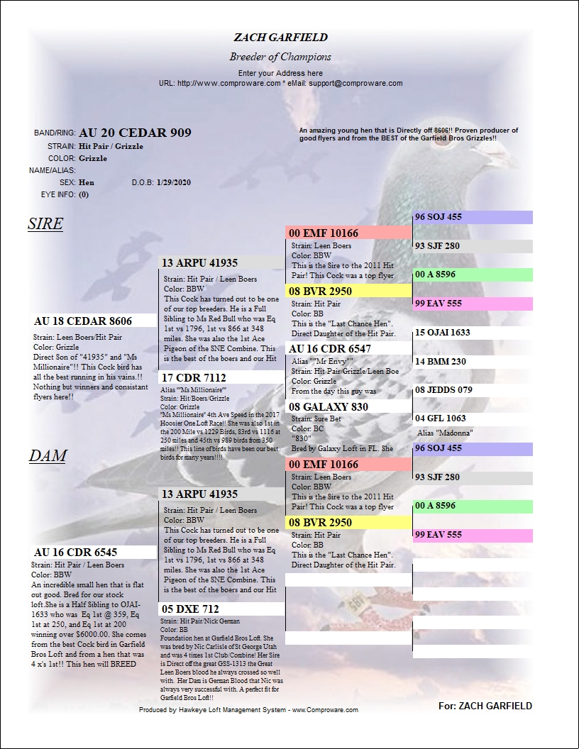Sire: 8606 Grizzle Cock. This Cock is a Direct Son of 41935 who was a full sibling to "Ms Red Bull" who won the 2011 New England Open vs 1780 plus birds, She was Eq 1st at 350 miles vs 989 the week after the Open. She was also the 1st Ace of the SNE Combine!! 41935 bred some big winners for us over the years. The Dam to 8606 is "Ms Millionaire" who was 1st vs 1200 plus at 200 miles in the Hoosier. This Cock bird bred us some really good pigeons!!