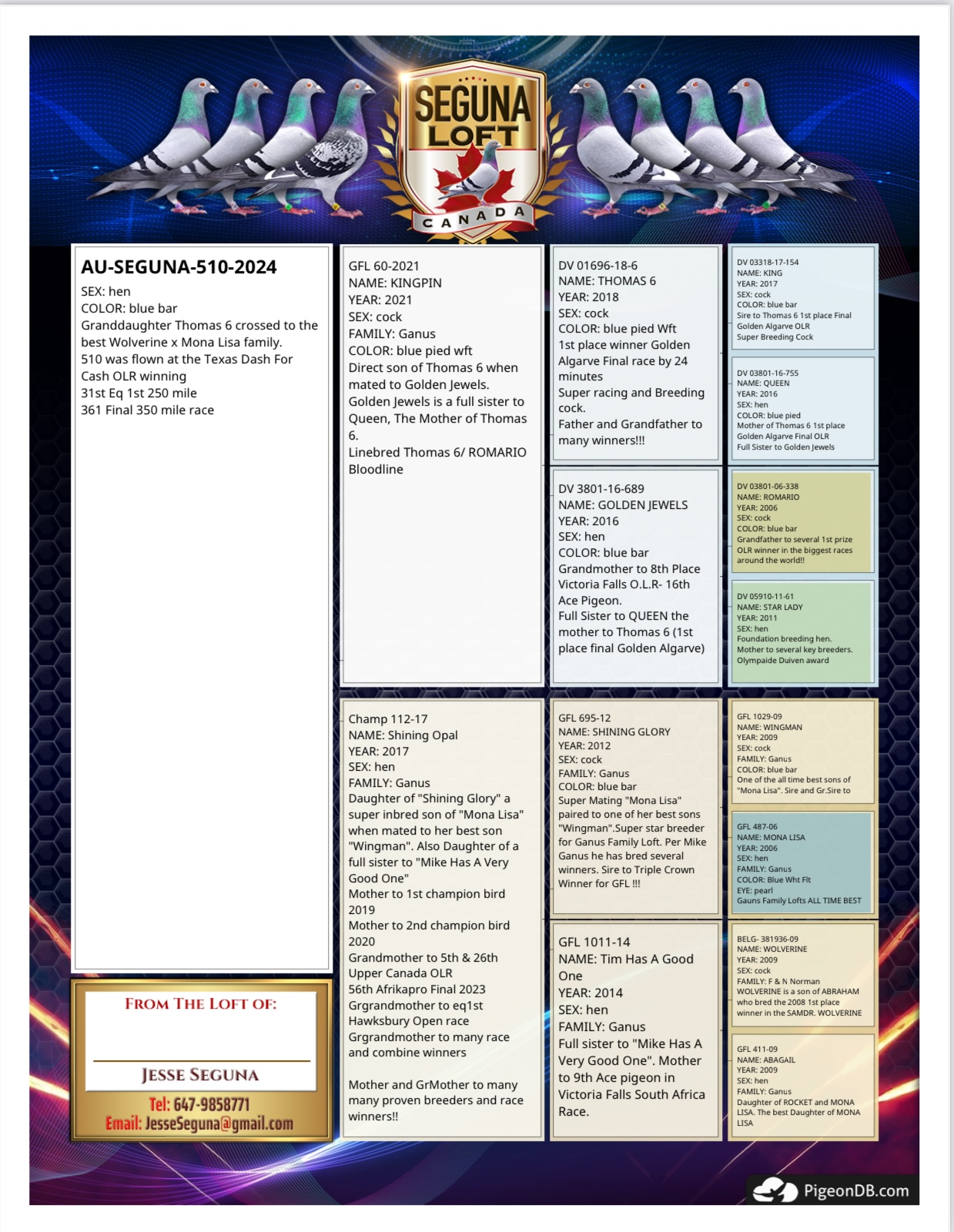 Super well bred hen with a super eye! Sire full brother to winged victory olr winner! Mated to seguna proven race hen can't go wrong !