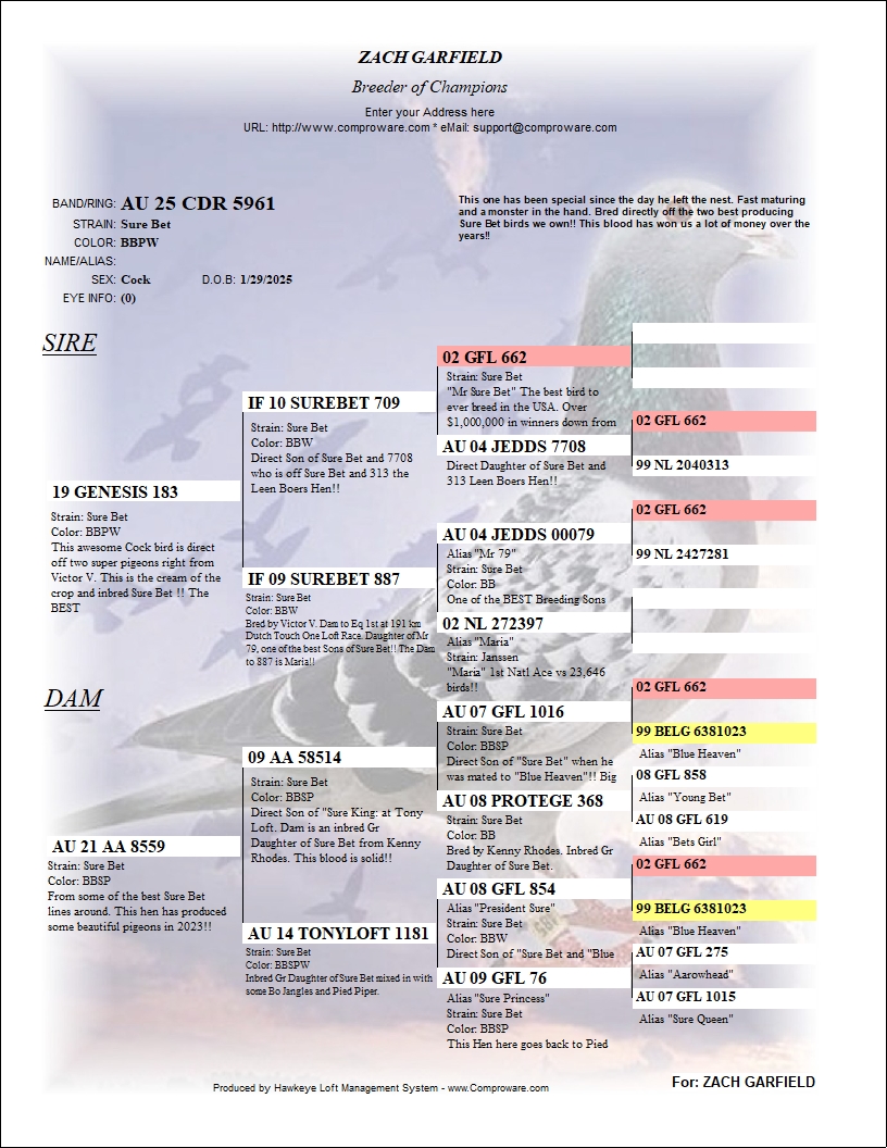 Id like each of you to pull this pedigree up and take a close look. You have Sure Bet on the pedigree 5 times and if Im correct off the pedigree another 2 to 3 times. For many years Sure Bet birds have dominated the One Loft races not only for us but for many other people around the world. DO NOT let this Cock bird get away. He is going to turn out to be a very special breeder. Thank you all for looking!!