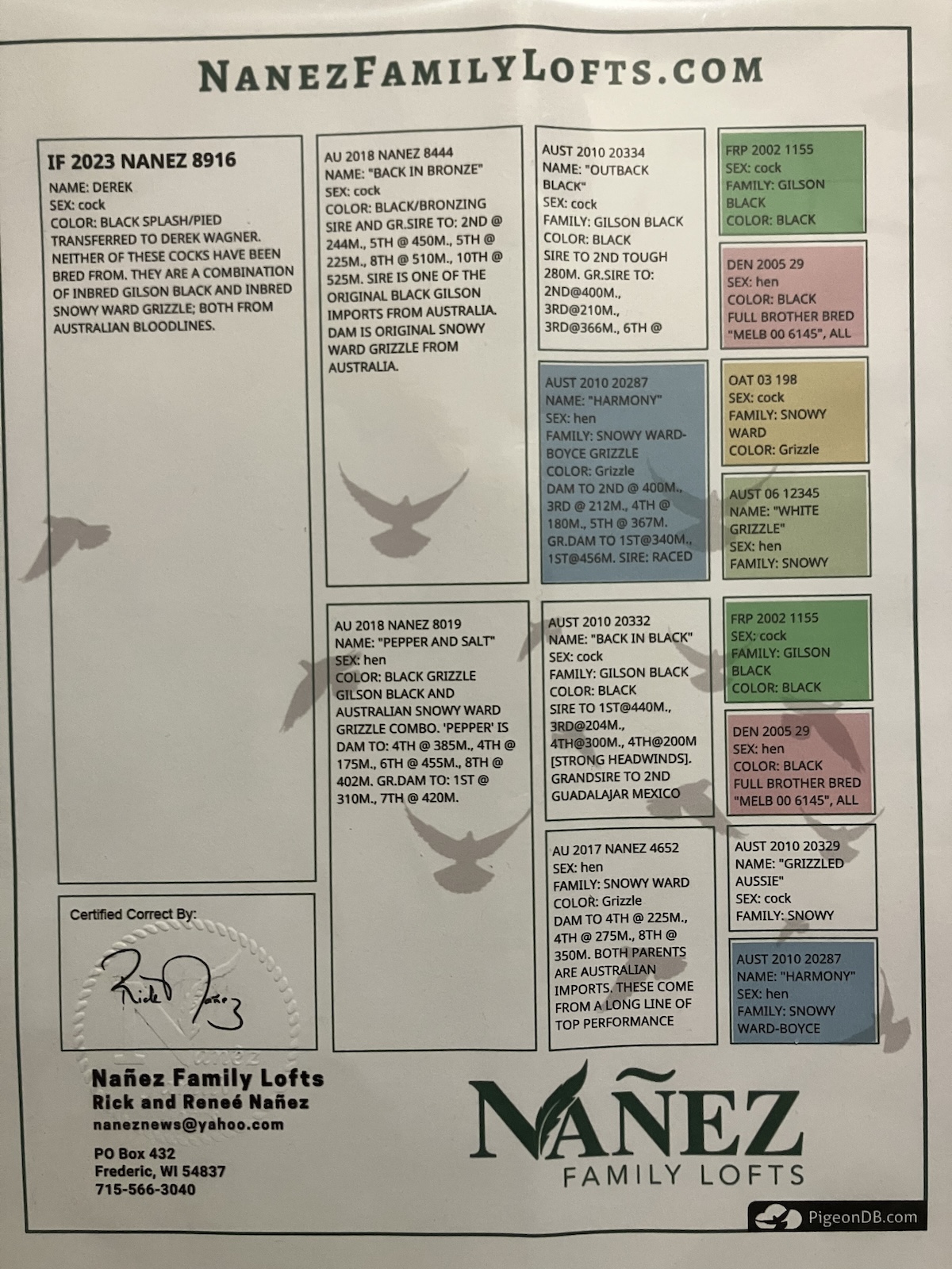 Bred by Nanez Family Loft from Australian long distance families. Slightly deeper keeled, this cockbird is built for the distance. If you are looking to add some toughness and distance into your speed family, this is it.