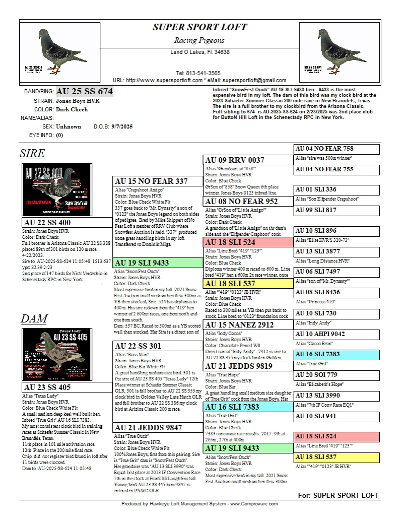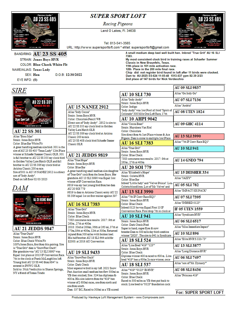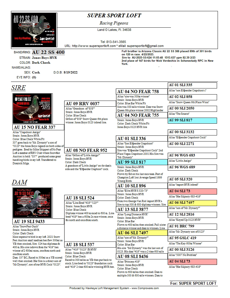 The sire of this bird is AU 22 SS 400 is a full brother to my clockbird from the Arizona Classic.