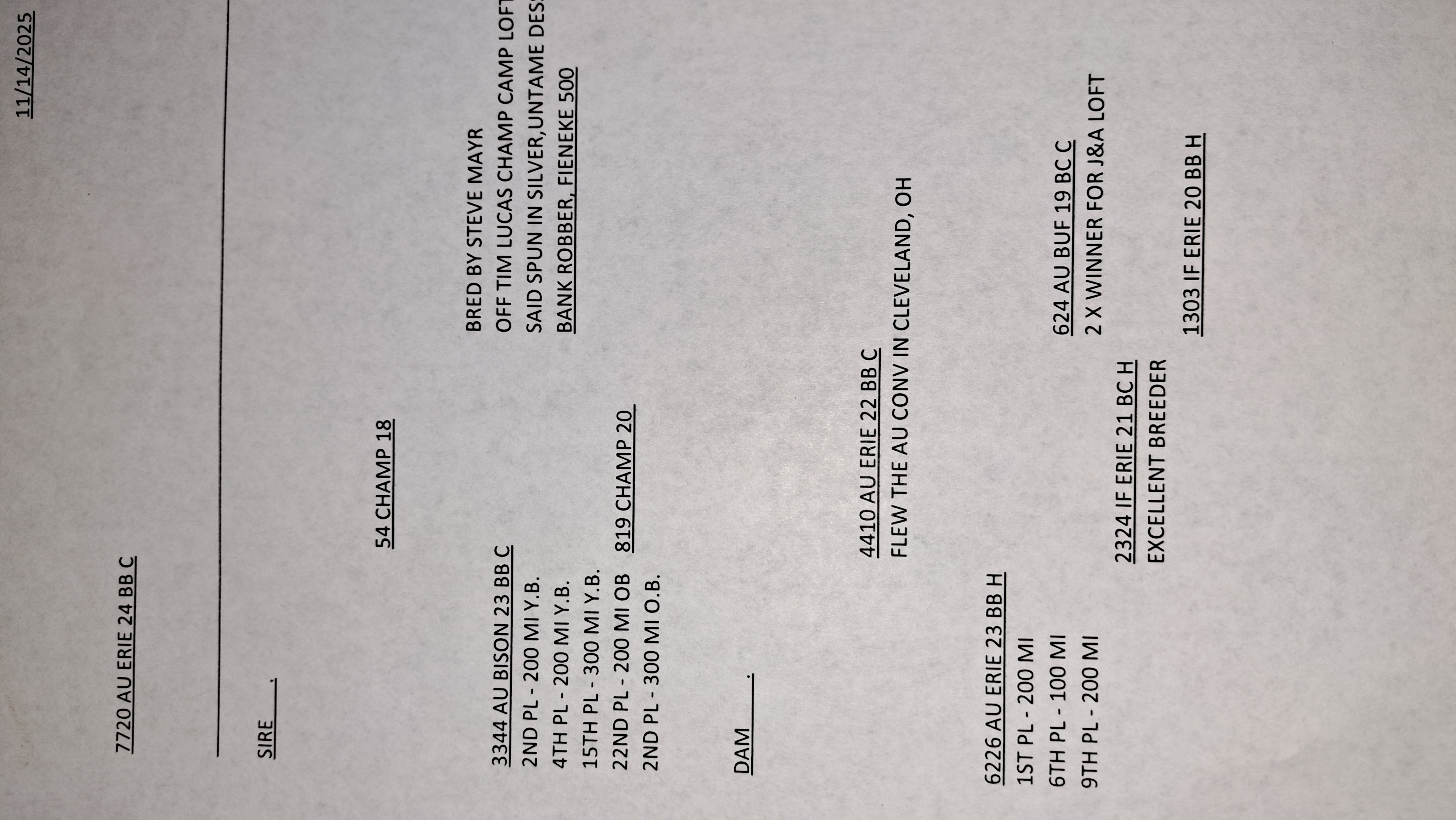 3344 AU BISON 23 BB C, bred by Steve Mayr. Off Champ Loft, Said Spun In Silver, Untamed Desert,Bank Robber and Fieneke 5000. He is a consistent racer for me 2nd - 200 mi yb, 4th - 200 mi, 15th - 300 mi yb, 22nd - 200 mi ob, 2nd - 300 mi ob.