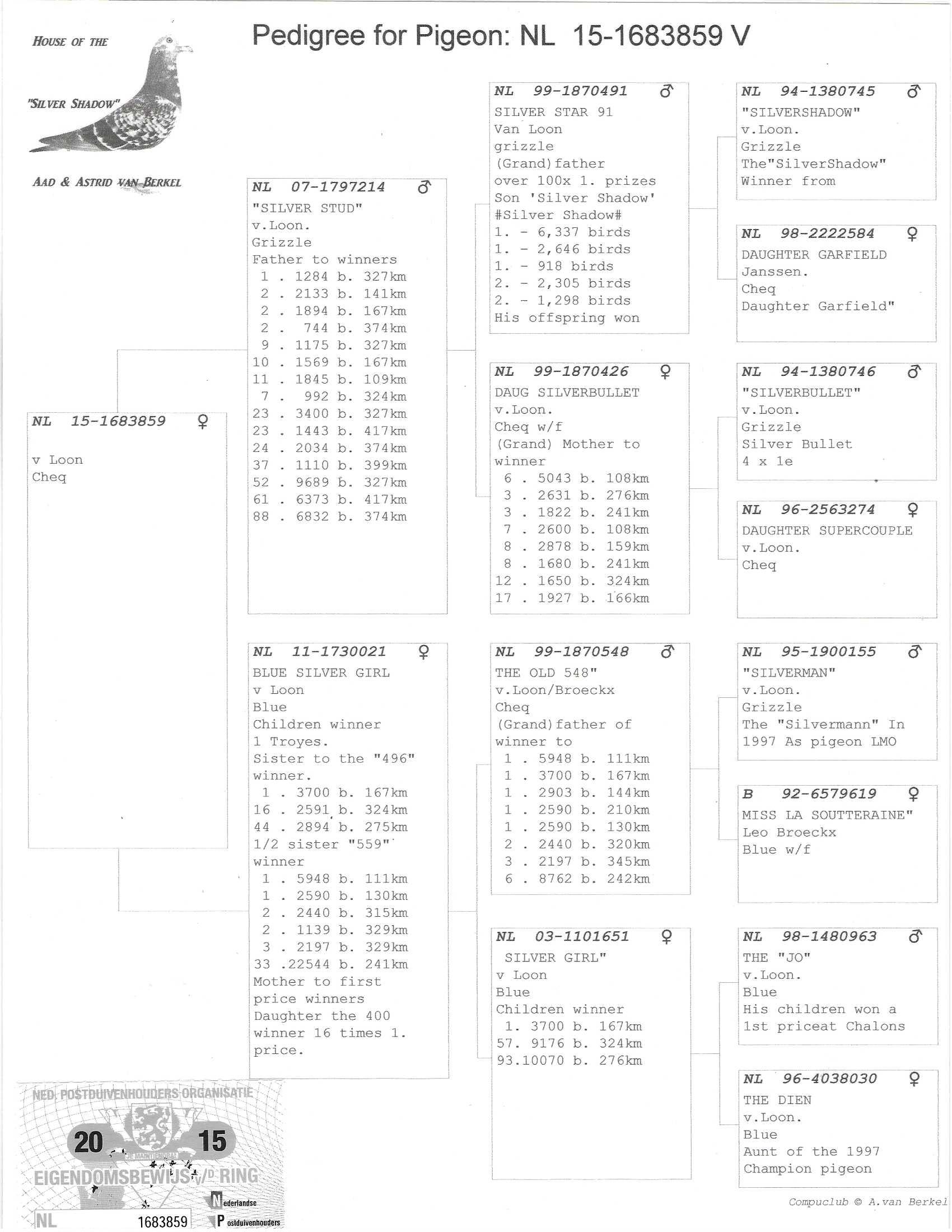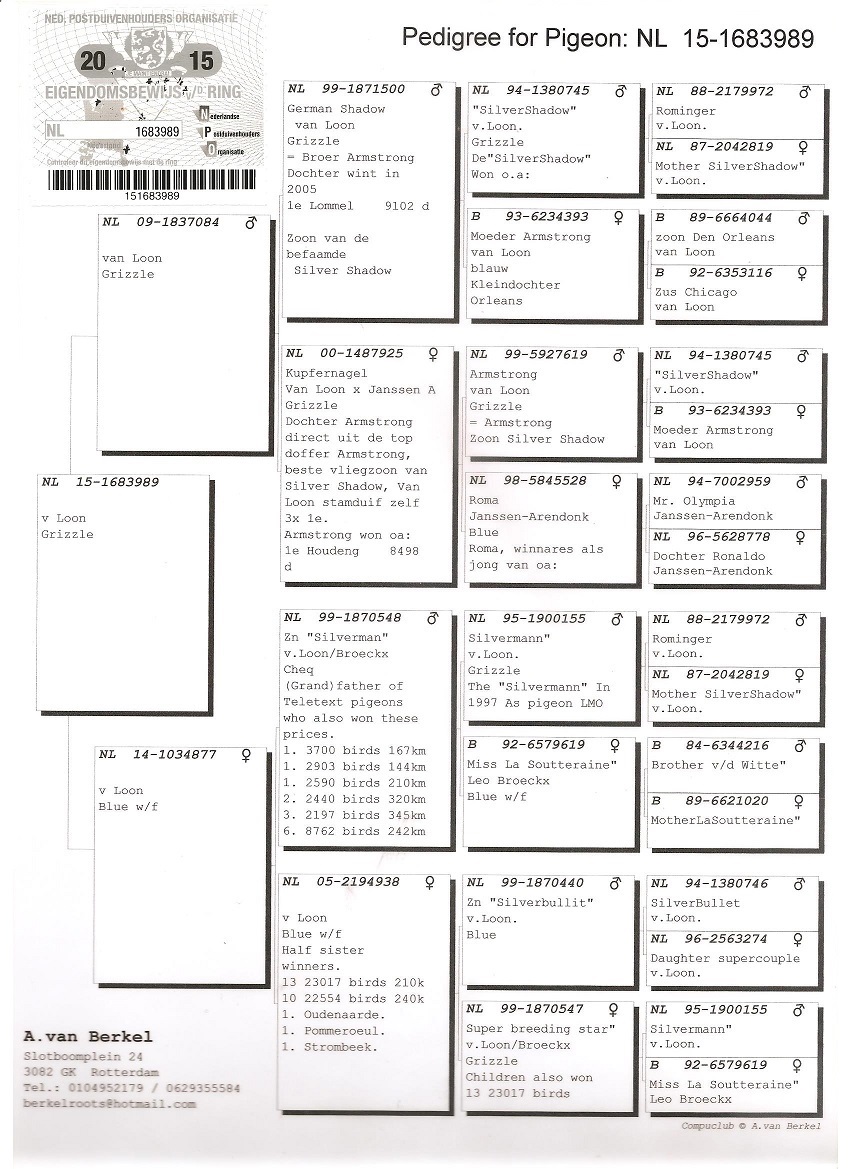This bird will come with copies of his Sire's and Dam's pedigree , sorry I don't have a pedigree software .