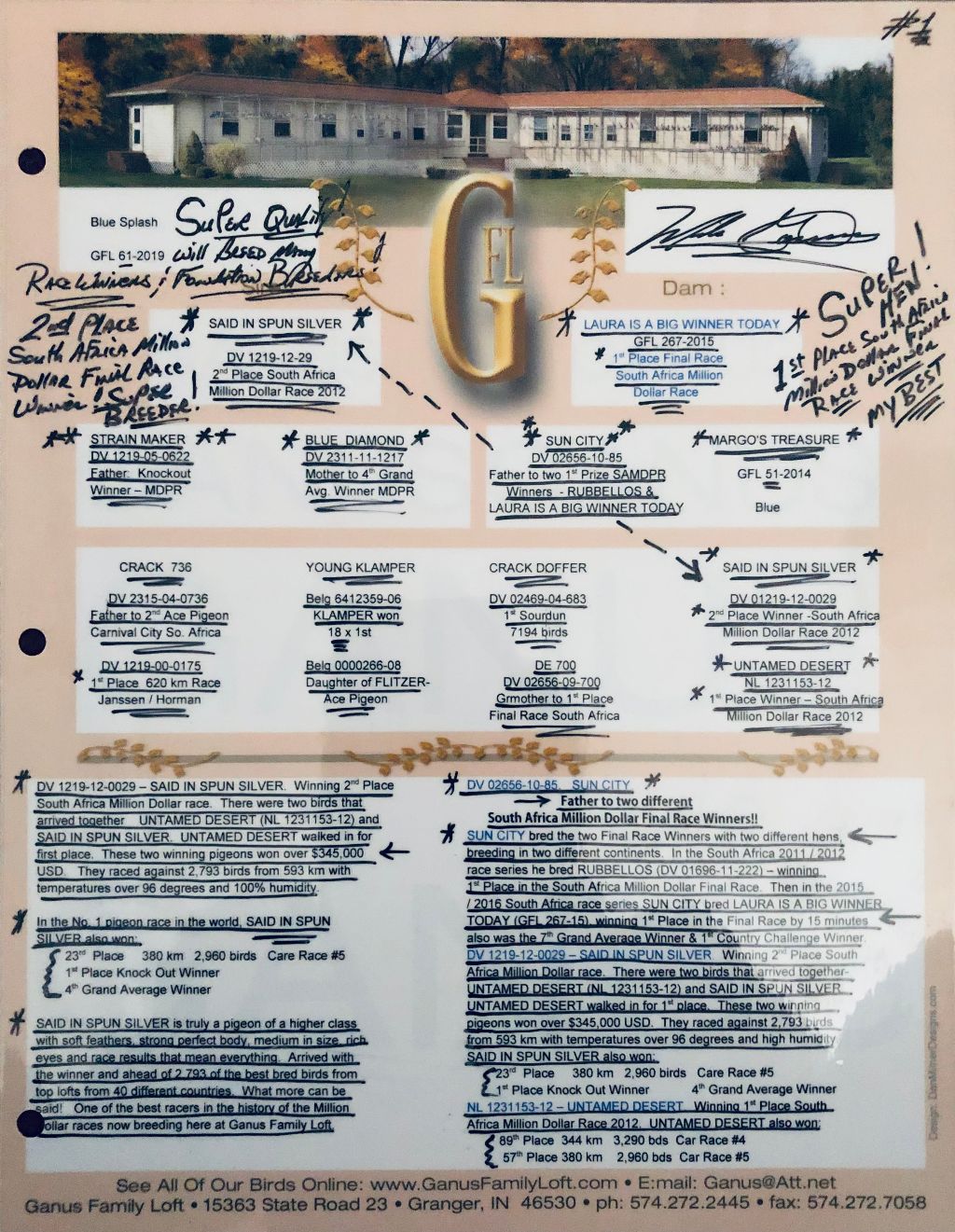 This was a one time mating and the two youngsters turned out awesome. Nestmate "RMR 25367" will also be listed in this week's auction. Well balanced, soft feather, tight vents, one pin tail. Sire: Double Grandson of "CHAMP COCK" AU Champion and AU Hall of Fame, father to 15x 1st place winners. Dave's #1 Cock for over 20 years. Dam: "MILLION DOLLAR BABY", Bought for 4,500 Euro in Pipa auction. Direct Daughter of Ganus's "SAID IN SPUN SILVER" 2nd place winner - South African Million Dollar race 2012 and "LAURA IS A BIG WINNER TODAY" 1st place, South African Million Dollar final race These are two very special youngsters you won't want to miss. I believe this is the hen but no guarantee on sex. Vaccinated and preventive canker treatment @ 30 days.