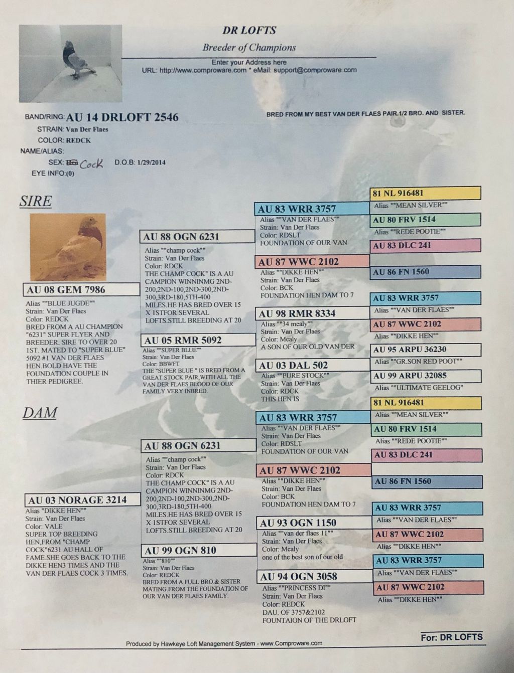 This was a one time mating and the two youngsters turned out awesome. Nestmate "RMR 25366" will also be listed in this week's auction. Well balanced, soft feather, tight vents, one pin tail. Sire: Double Grandson of "CHAMP COCK" AU Champion and AU Hall of Fame, father to 15x 1st place winners. Dave's #1 Cock for over 20 years. Dam: "MILLION DOLLAR BABY", Bought for 4,500 Euro in Pipa auction. Direct Daughter of Ganus's "SAID IN SPUN SILVER" 2nd place winner - South African Million Dollar race 2012 and "LAURA IS A BIG WINNER TODAY" 1st place, South African Million Dollar final race These are two very special youngsters you won't want to miss. I believe this is the cock but no guarantee on sex. Vaccinated and preventive canker treatment @ 30 days.