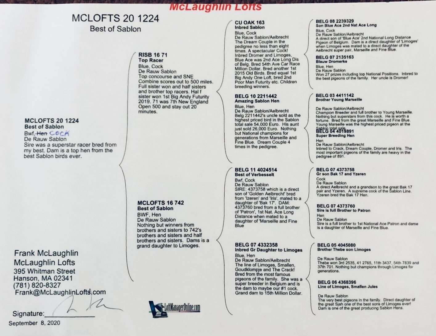 Sire: Super handling male that was hand selected by Frank McLaughlin from his Best Sablons. Dam: "LUCKY CHARM" Father Inbred "LUCKY 848" Imported "ABENRA" in 2023 from Paul McBurnie. Mother "GUSSY 14". Mother to "SPARTACUS GAL" , Top Racer for Vicstrom loft 2021 YB: 5th Champion Bird, 2nd, 3rd, 6th, 6th, 8th, 13th 113 miles to 238 miles. OB 2022 12th Concourse, 504 m., 206 b., 32 lofts. These are Great tough weather birds that don't get lost. Parentage guaranteed, Bred in an individual breeding pen. Vaccinated and preventive canker treatment @ 30 days. Pretty sure this is a cock, but no guarantee on sex.
