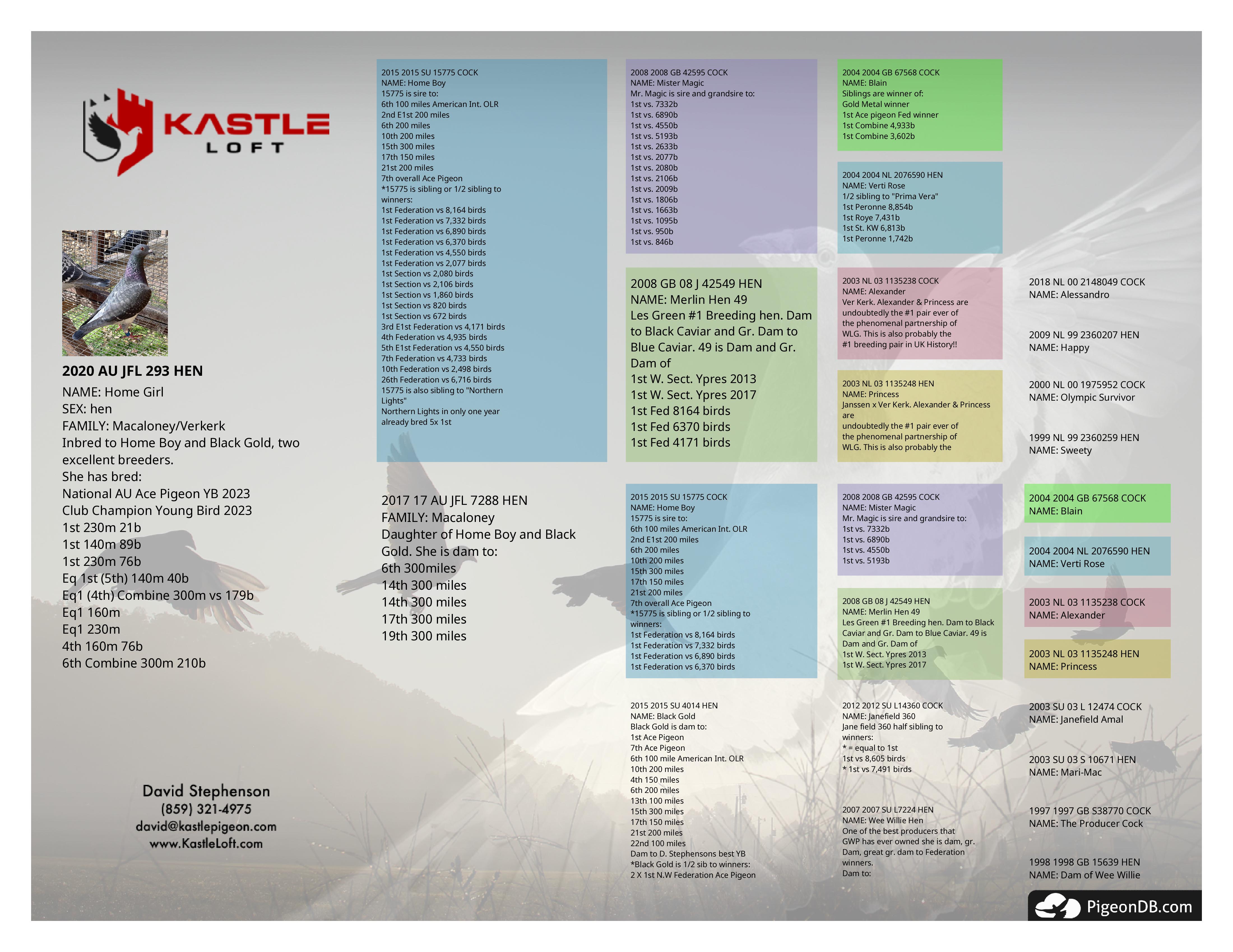 This hen was bred by Kevin Jones and inbred to one of his great Macaloney cocks, Home Boy. She is a 2020 hatch and has a very good breeding record, especially at the sprints and 300 miles. She is LDHA AB.
