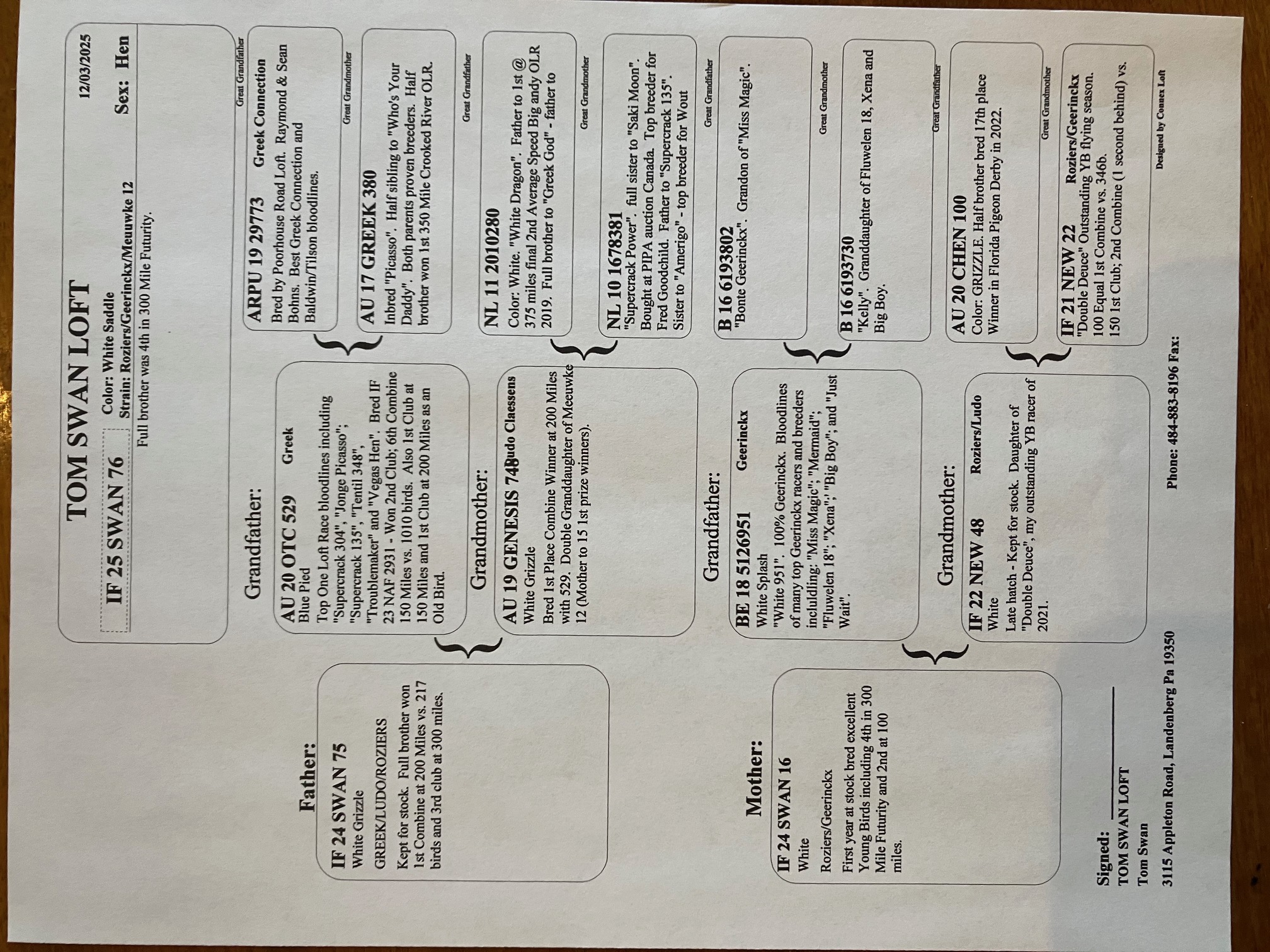 Full brother was 4th in our 300 Mile Club Futurity Race. Another full brother 2nd Club at 100 Miles. Half brother was 2nd Club, 6th Combine at 150 Miles vs. 1010 birds; 1st Club at 150 Miles and 1st Club at 200 Miles as an old bird.