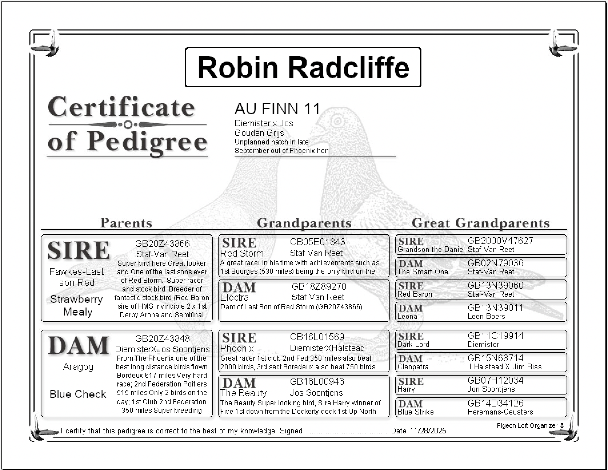 Dam: ARAGOG (GB20Z43848) DiemisterxJos Soontjens: From The Phoenix one ofthe bestlong distance birds flown Bordeux 617 miles Very hard race; 2nd Federation Poitiers 515 miles Only 2 birds on the day; 1st Club 2nd Federation 350 miles