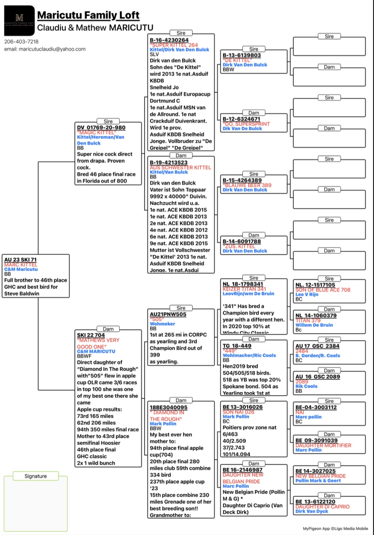 the mother of this bird is my best daughter of diamond in the rough. She bred 2x 1st in a local little OLR we had here. She also bred a Hoosier money winner on the semifinal race 45th place semifinal Hoosier. She also bred 23rd place apple cup semifinal. I think this bird would be great for OLR Don't miss out on this super opportunity.