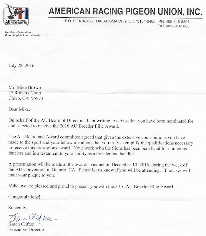 Skylake Sions are very proud to have been selected by the American Racing Pigeon Union for the Elite Breeders Award for 2016. I have enjoyed racing pigeons for over 40 years winning 4 California State Hall of Fame, several AU Champs and numerous Average Speed Awards We all know quality pigeons are the quickest road to success. Remember, no one can promise you more than pedigree and health. You are welcome to visit our website at www.skylakesions.com Mike