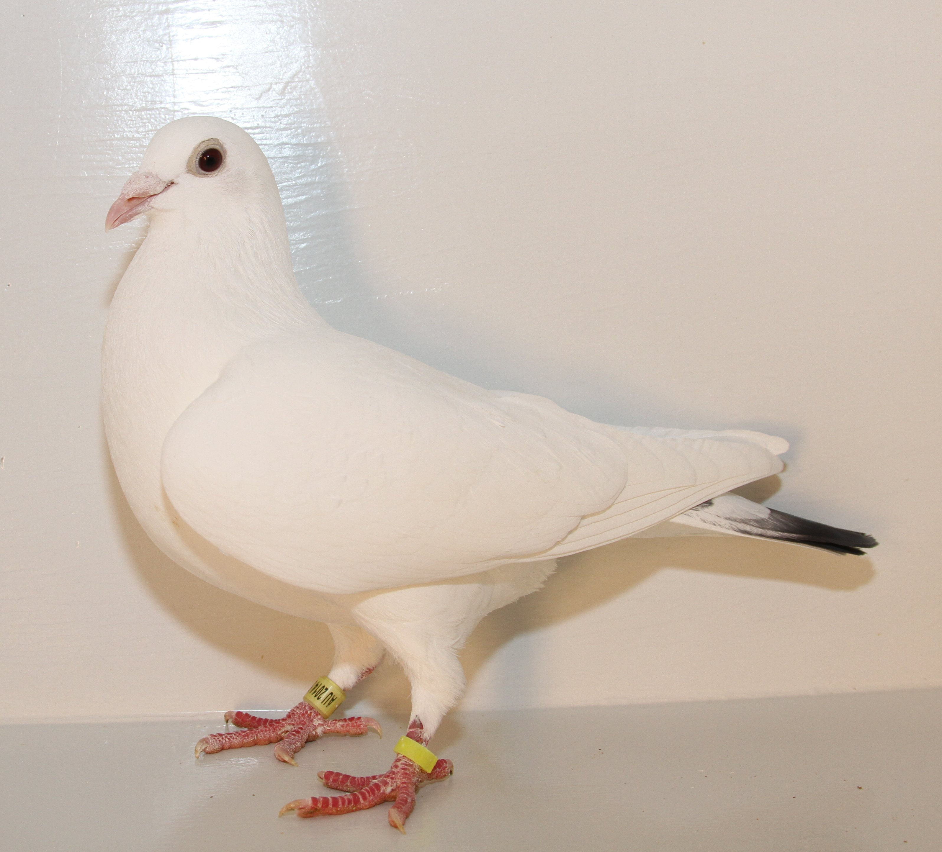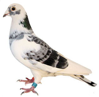 Dam: "Jenny" 1st 300, 5th 500, 9th 600 stocked Her sister is “Miss Wenatchee” 1st 550 miles 2006 Old Birds. Another super daughter of Handsome! She was one of the last birds he bred before going infertile. Sire is "Handsome" AU 91 NSH 5079. He has bred 12 race winners with many different hens. Her dam is "Baby's Blue" Super racer in 2 years 1st 500, 1st 400, 1st 400 yearling special, 1st 175, 10th 500, 9th 175, 10th 250, 16th 300, 18th 175.